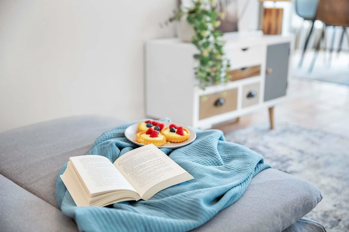 • Ein bequemes Sofa im Wohnzimmer bietet eine weitere Schlafmöglichkeit.
