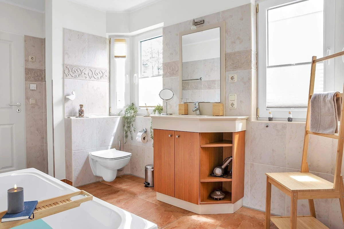 • Ein grosszügiges Vollbad im Obergeschoss mit Badewanne und Dusche, sowie ein weiteres Bad im Erdgeschoss.