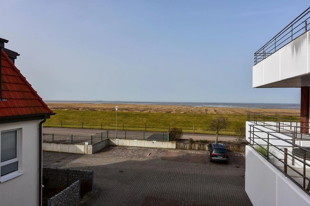 Der Wohnbereich ist mit einer Essecke, einer Couch mit Sessel, TV und WLAN. Vom Wohnbereich haben Sie Zugang zum Balkon, von dem Sie einen tollen Ausblick auf das Wattenmeer, das Vogelschutzgebiet und die Insel Neuwerk geniessen.