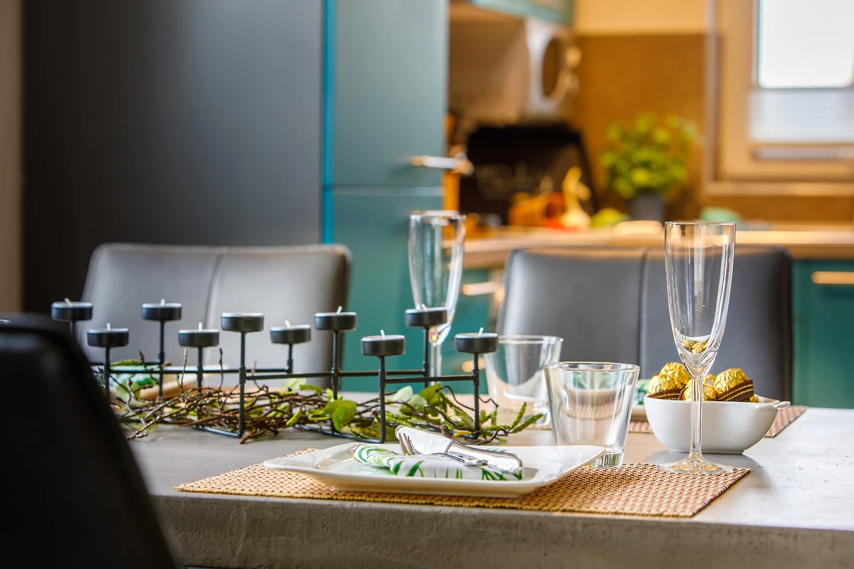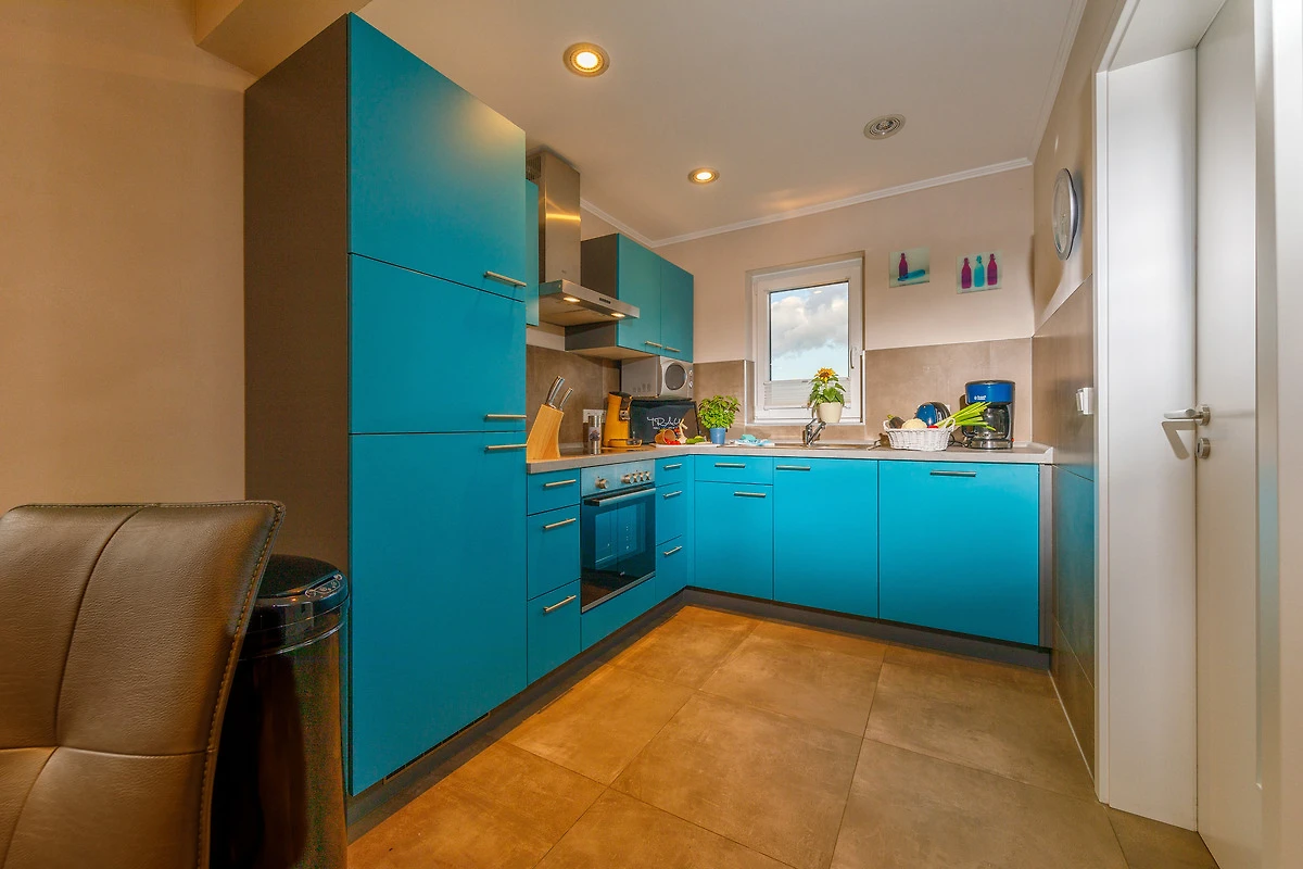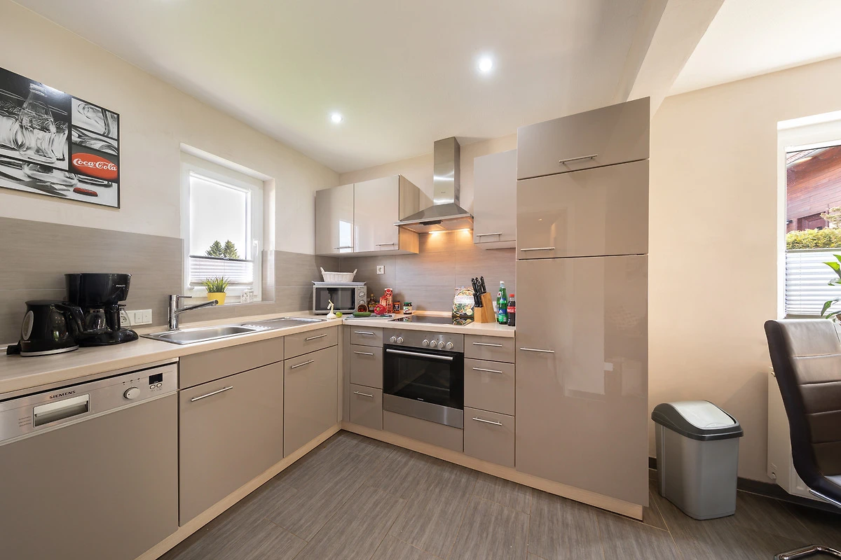 1 moderne vollausgestattete Küche mit Geschirrspüler, Mikrowelle, E-Herd (Ceran) mit Backofen, Kühl-/ Gefrierkombination, Toaster, Kaffeemaschine, Padmaschine, Mikrowelle u.v.m.