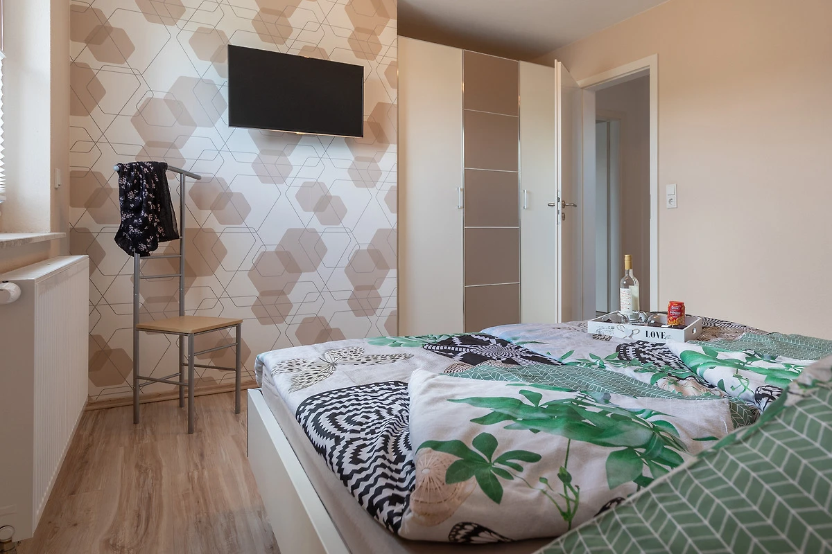 1 Schlafzimmer mit Doppelbett, Kleiderschrank, SAT- TV