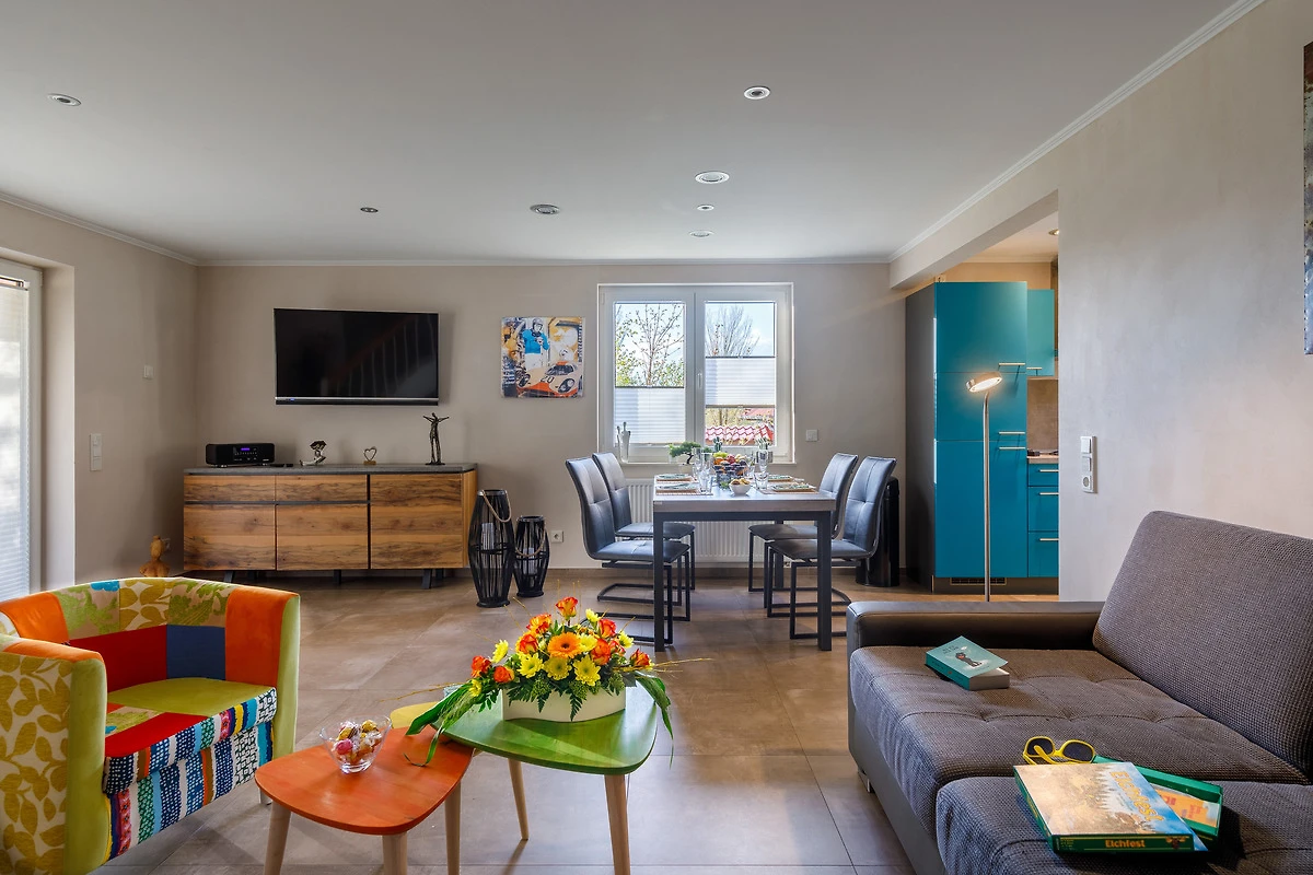 1 Wohn- / Essbereich mit Schlafcouch (für 1 - 2 Personen),SAT-TS mit grossen Flachbildschirm