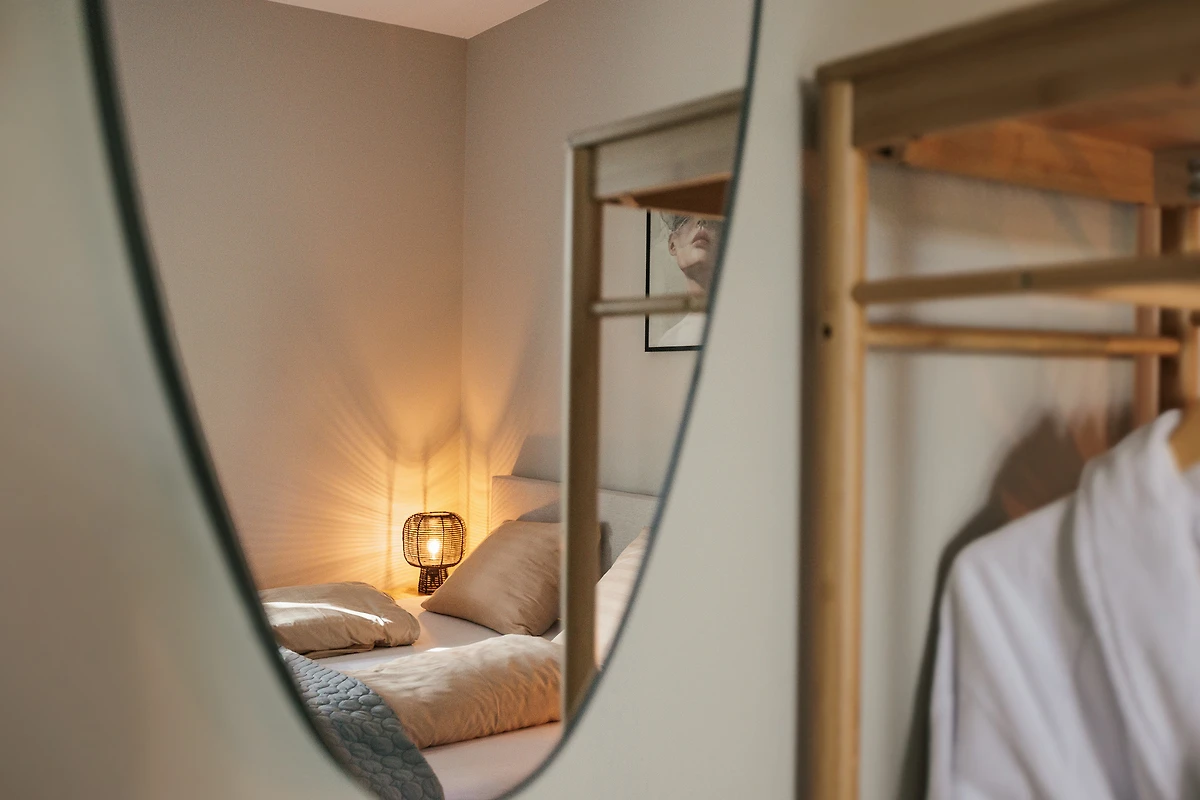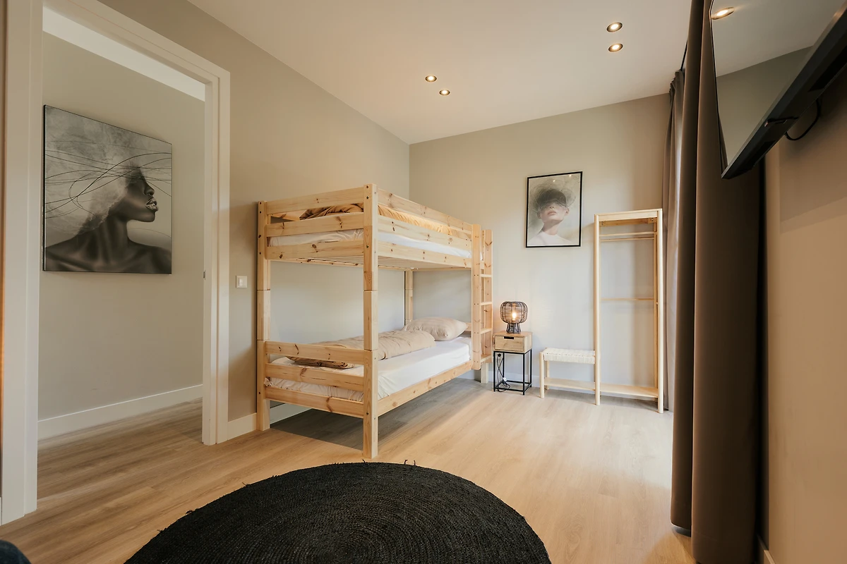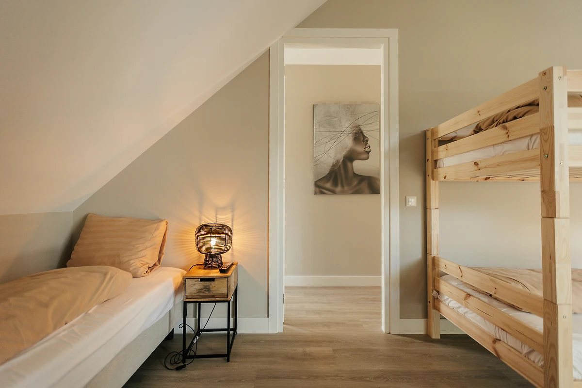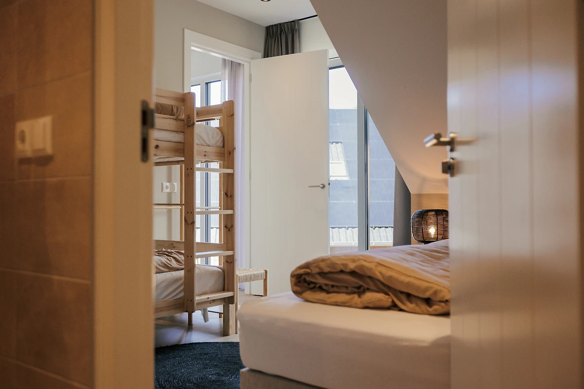 Zwei Zimmer mit einem Etagenbett und einem Einzelbett, jeweils mit separatem Bad und Zugang zu einer Sauna.Vier Schlafzimmer mit Doppelbetten, von denen zwei zusätzlich über ein Etagenbett verfügen.