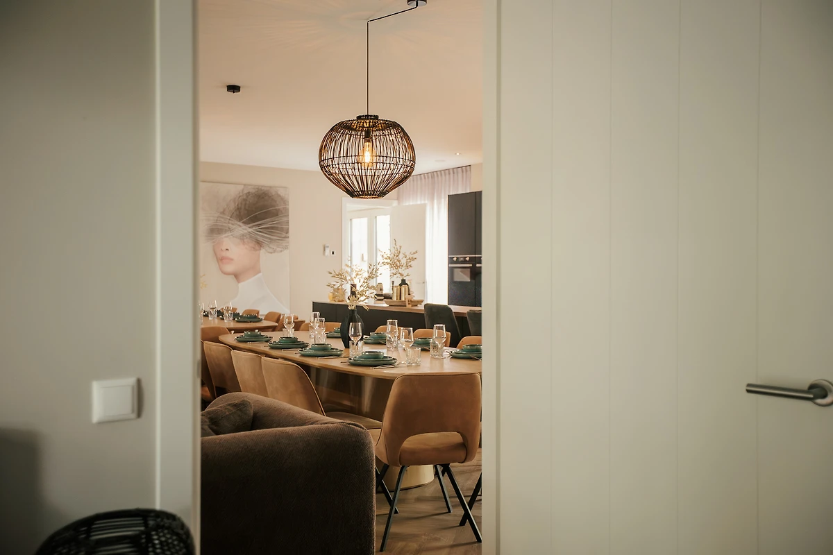 Beim Betreten gelangen Sie in ein grosszügiges Wohnzimmer mit bequemen Sitzmöbeln und einem Smart-TV mit Streaming-Funktion – ideal für gemütliche Abende mit Familie und Freunden.
