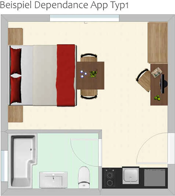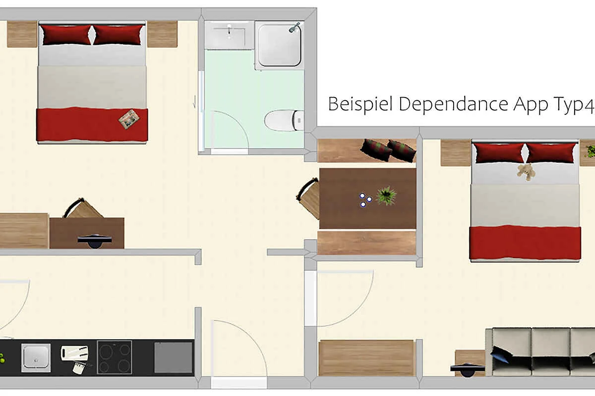 Der Eingang in Ihre Ferienwohnung befindet sich im Erdgeschoss, ist ebenerdig und führt direkt in den Vorraum. Wohnzimmer mit Sitzecke, TV und Schreibtisch. Schlafzimmer mit 1 Doppelbett. Schlafzimmer mit 1 Doppelbett und Gitterbett als Überbelegung möglich: Ja. Küche mit Geschirrspüler, Kühlschrank, Mikrowelle, Kaffeemaschine, elektrischem Wasserkocher und Gas- oder E-Herd. Bad mit Dusche, WC und Föhn.
