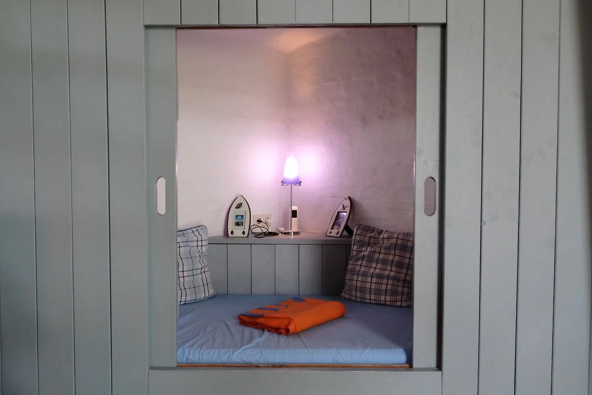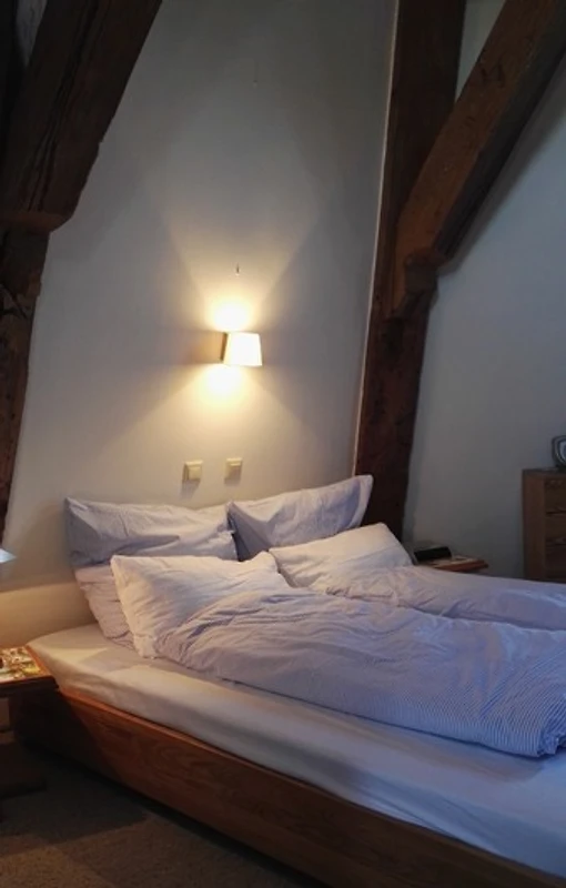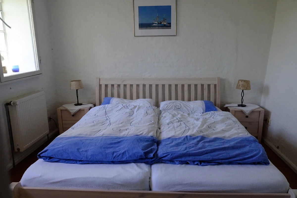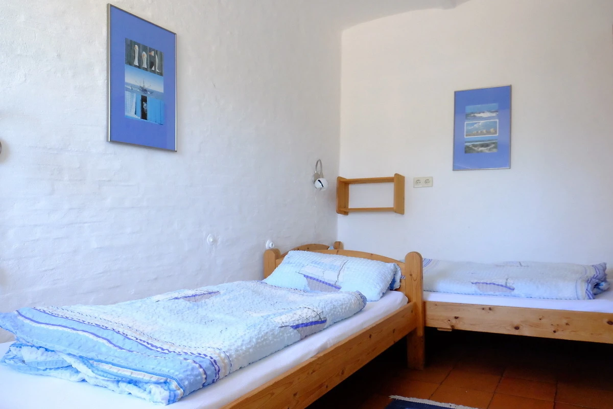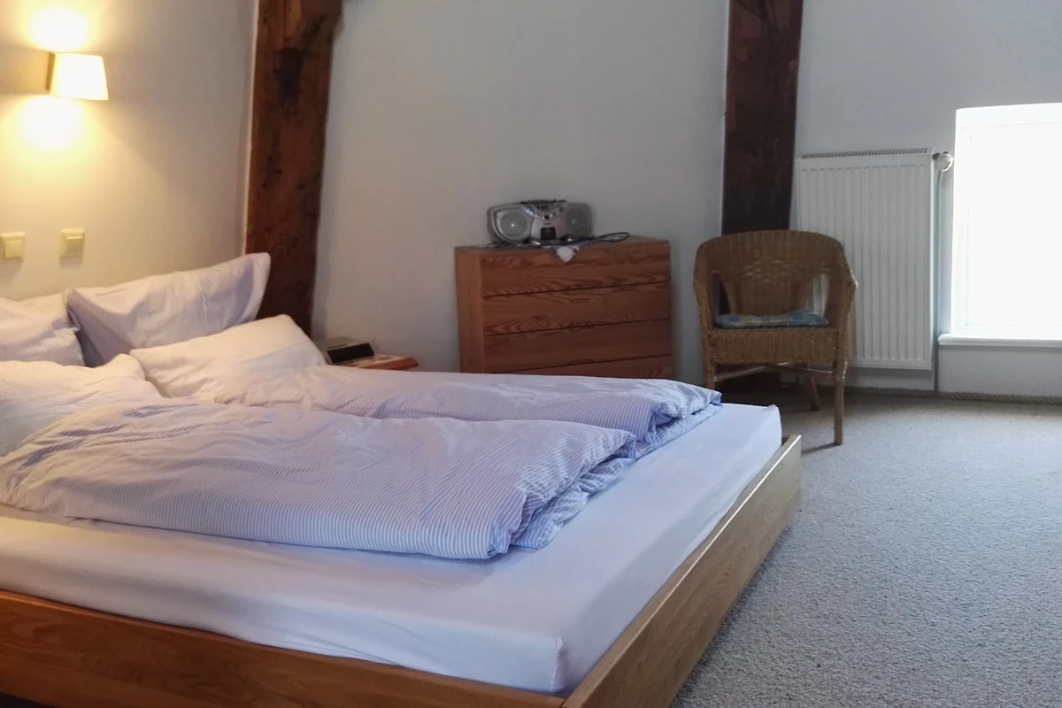 Die Mühle verfügt über drei Schlafzimmer: Ein Zimmer mit 180cm Doppelbett, das Turmzimmer mit 140cm Doppelbett und ein Kinderzimmer mit zwei 90cm Einzelbetten.