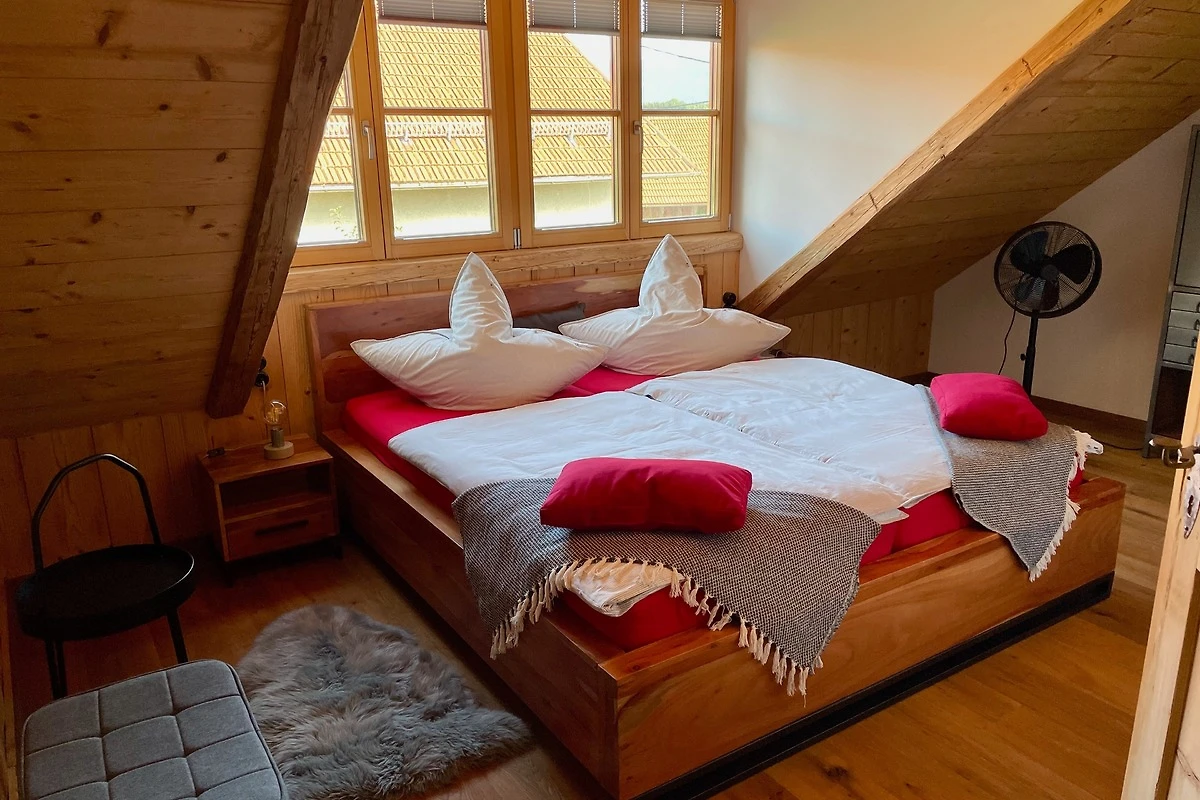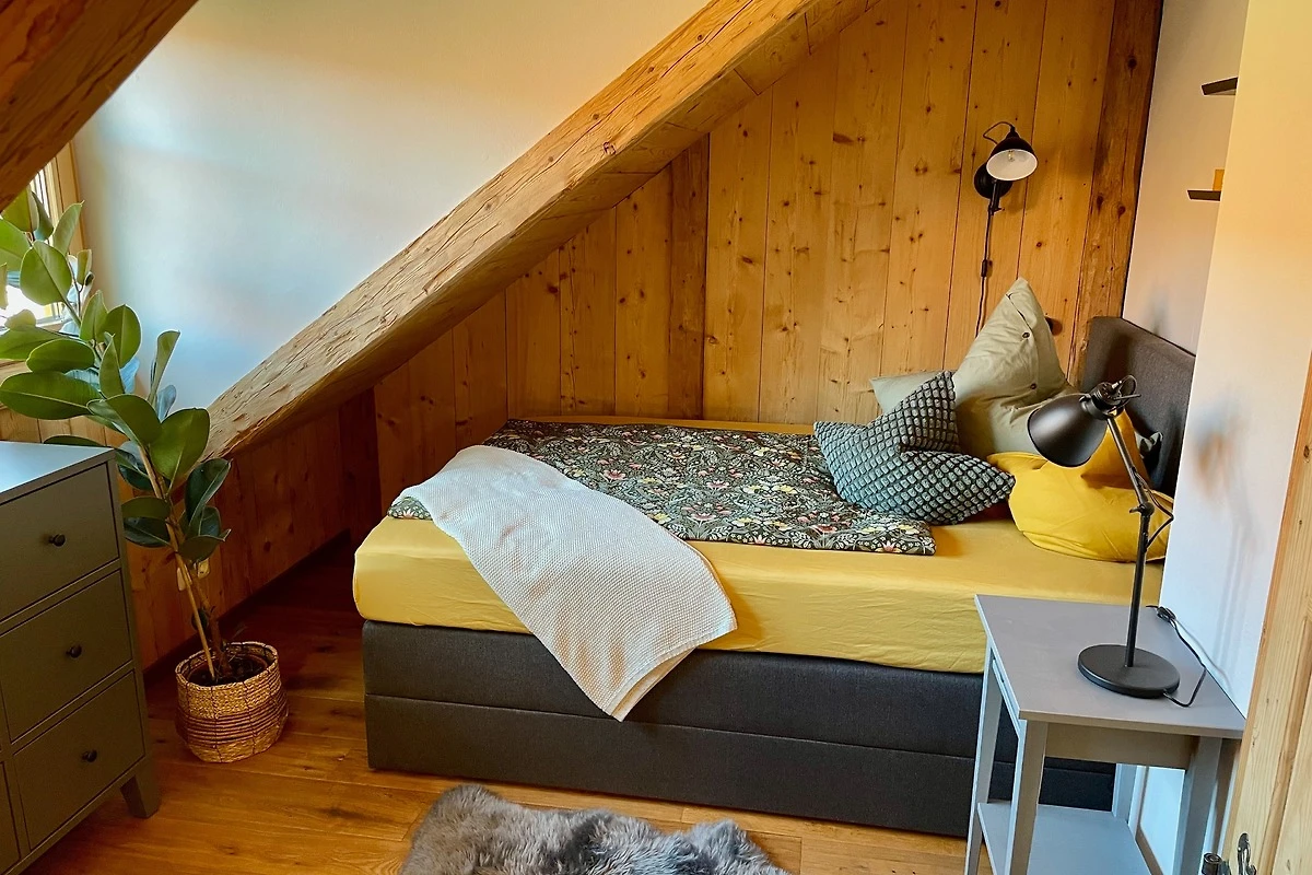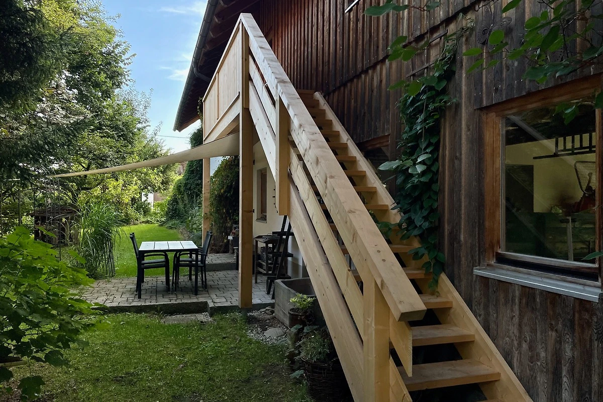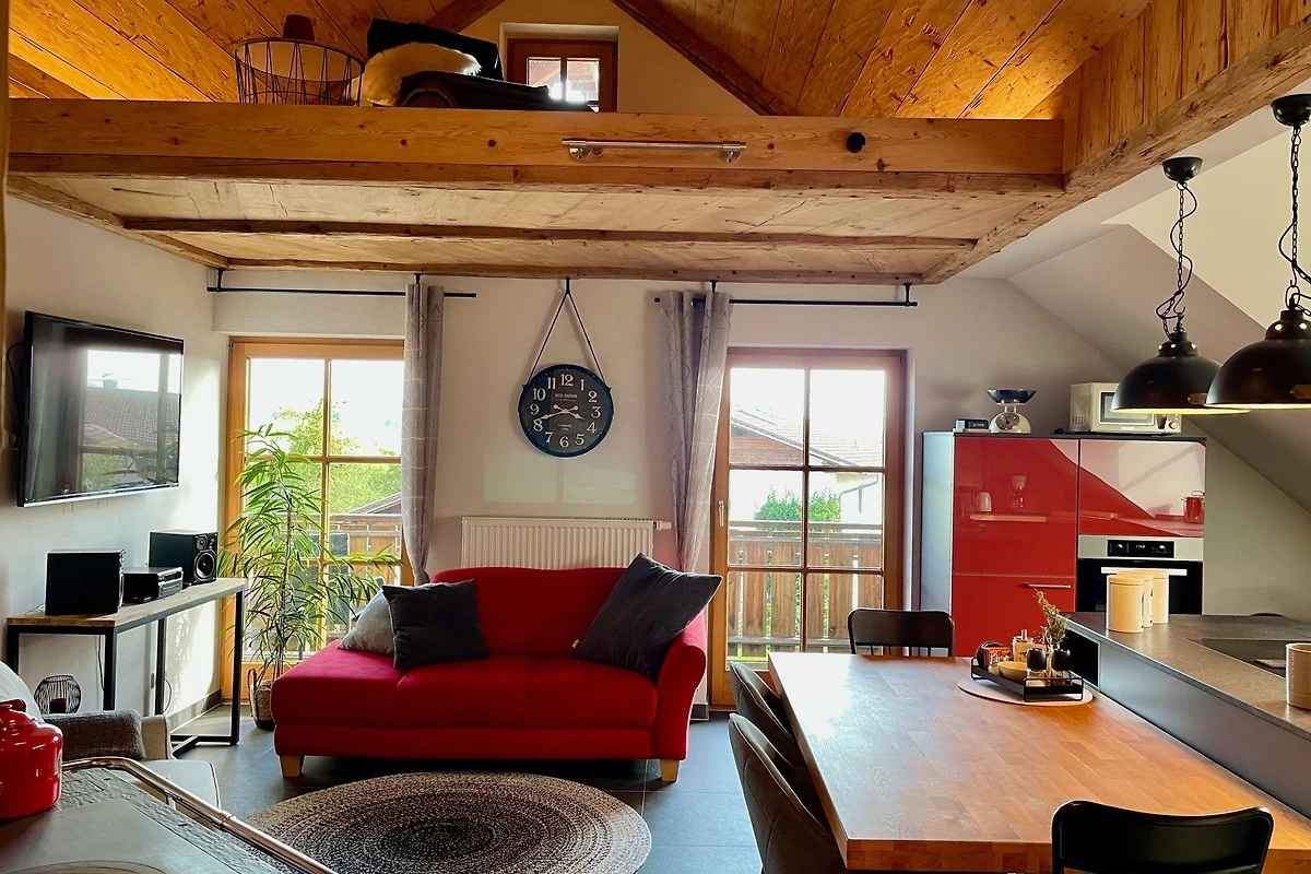 Wir freuen uns, Ihnen unsere neu ausgebaute Ferienwohnung zu präsentieren. Über eine Aussentreppe gelangen Sie in das separate Treppenhaus der Wohnung. Eine weitere Treppe führt in das Dachgeschoss. Dort erwartet Sie das etwa 80 Quadratmeter grosse, lichtdurchflutete Feriendomizil. Vom Balkon aus geniessen Sie den herrlichen Blick auf die saftig grünen Wiesen und die imposante Ammergauer Alpenkette.