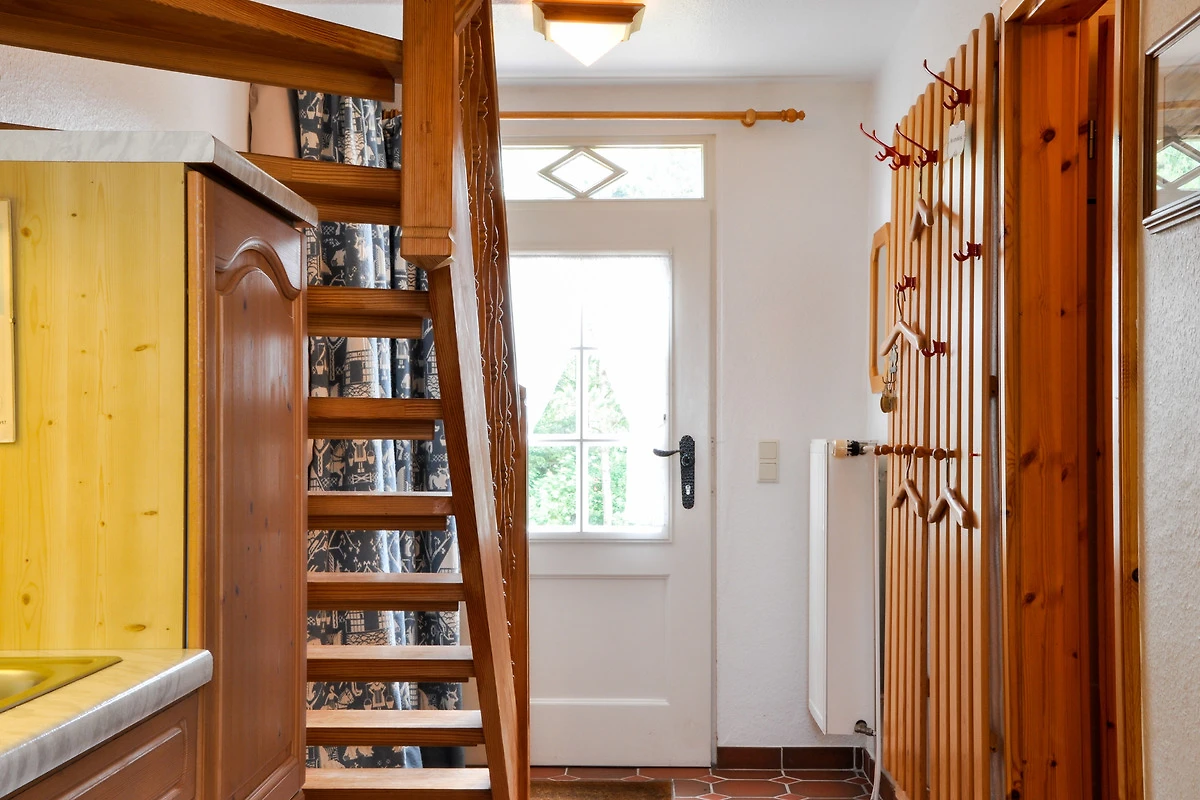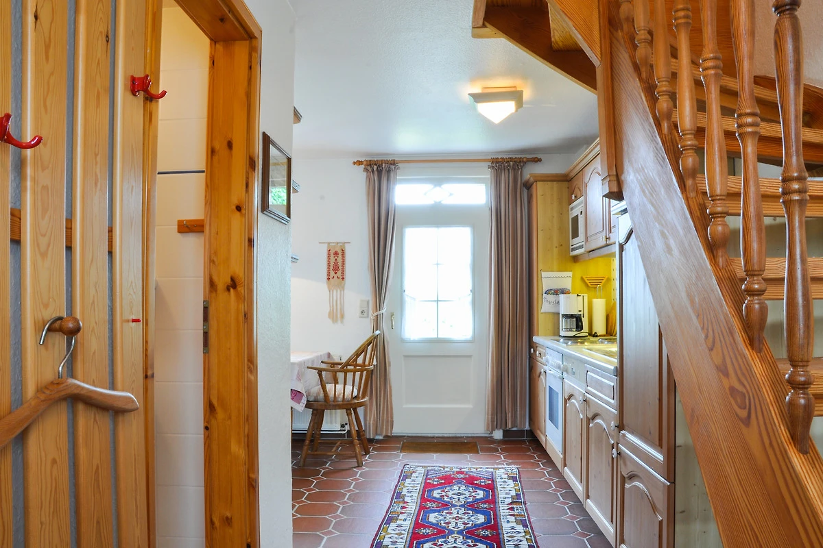 Wohnung Lise, die mittlere der drei Ferienunterkünfte, ist mit ca. 50 m2 Wohnfläche die kleinste im Haus Karoline. Sie bietet Platz für bis zu 3 Personen. Im Erdgeschoss befindet sich ein schöner Wohn- Essbereich mit integrierter, gut ausgestatteter Küche (Geschirrspüler und Mikrowelle) und ein kleines Gäste-WC. Badezimmer und die beiden Schlafzimmer, eines mit Doppelbett und eines mit Einzelbett sind im 1. Stock. Auf der Terrasse können Sie den Tag gemütlich ausklingen lassen.