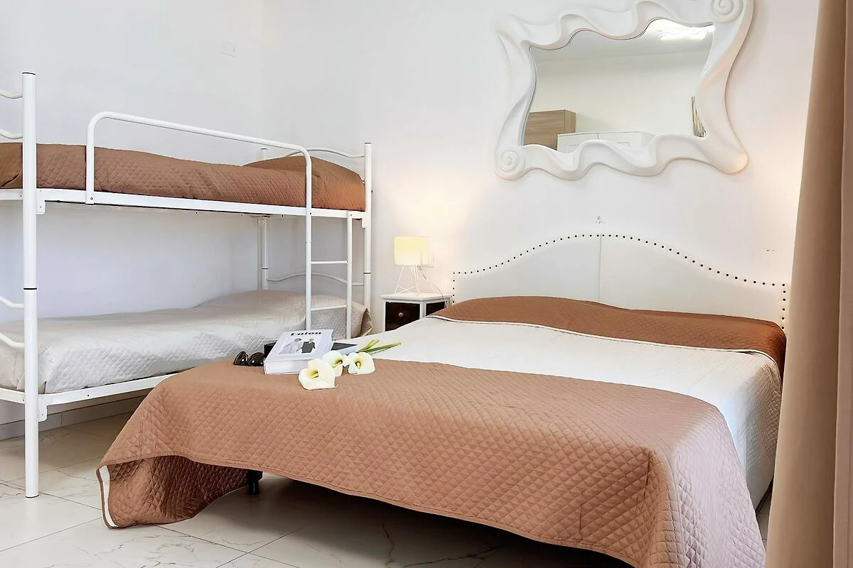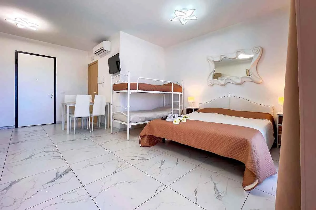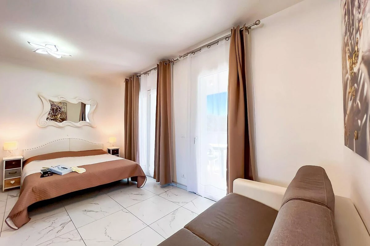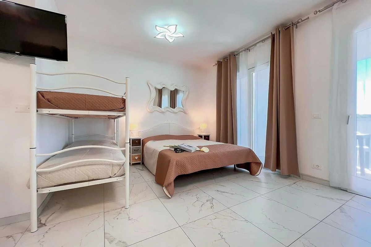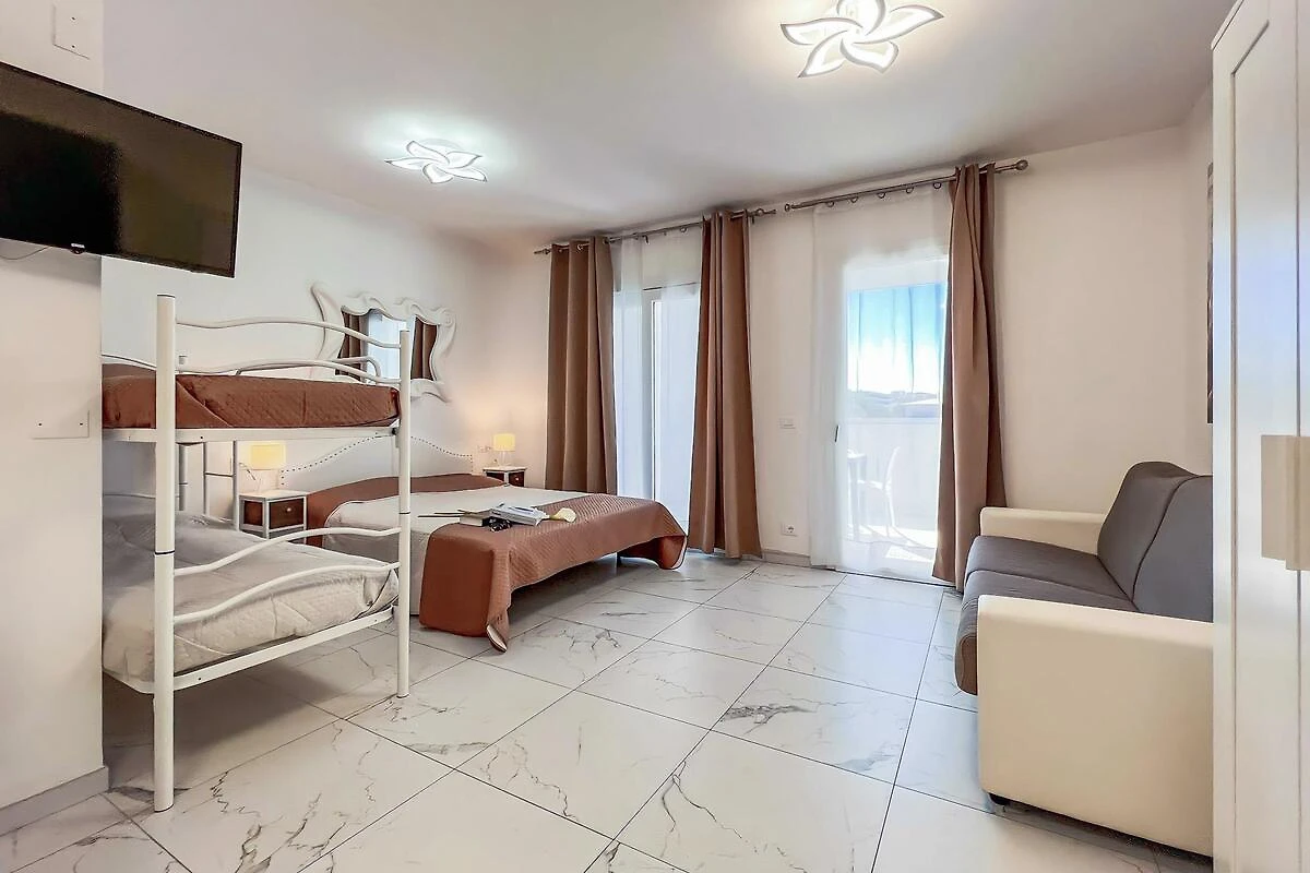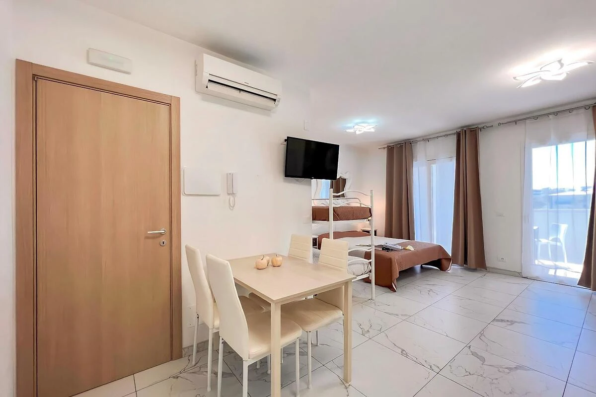 Der Eingang in Ihr Studio befindet sich im Obergeschoss und führt direkt in das Wohn/Schlafzimmer. Kochnische im Wohn/Schlafzimmer mit Essecke, Elektroherd (4 Platten), Backofen, Kühlschrank (Eisfach) und Mikrowelle. Bad mit Dusche, 1 Waschbecken, WC und Bidet. Wohn/Schlafzimmer mit 1 Doppelbett, 2 Zusatzbetten auf Doppelausziehcouch, 1 Etagenbett, TV und Zugang zum Balkon.
