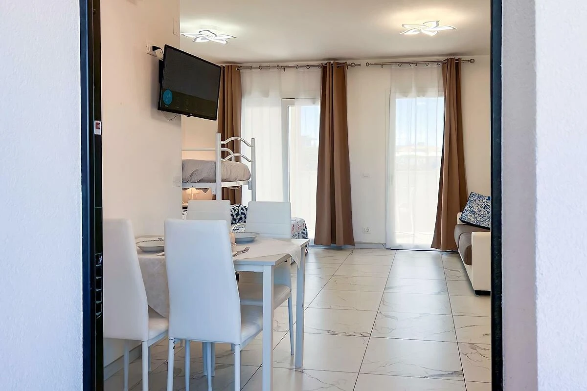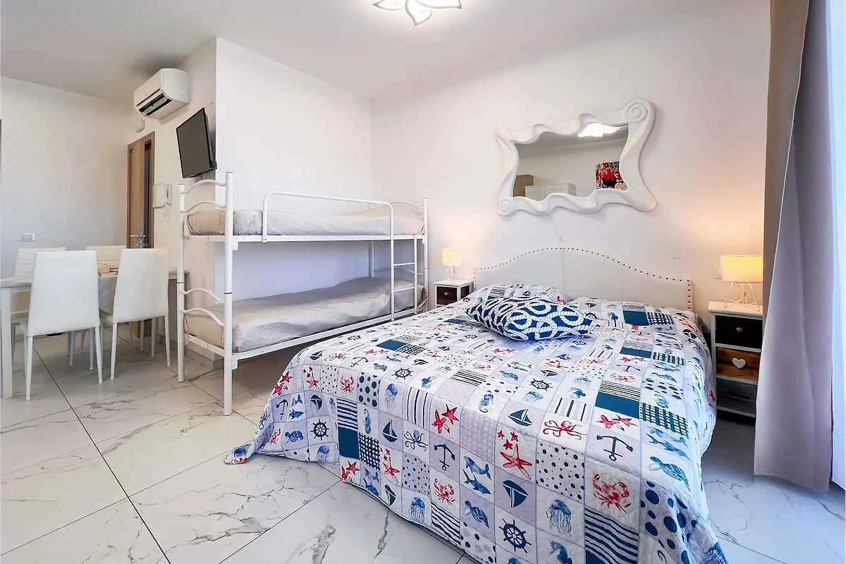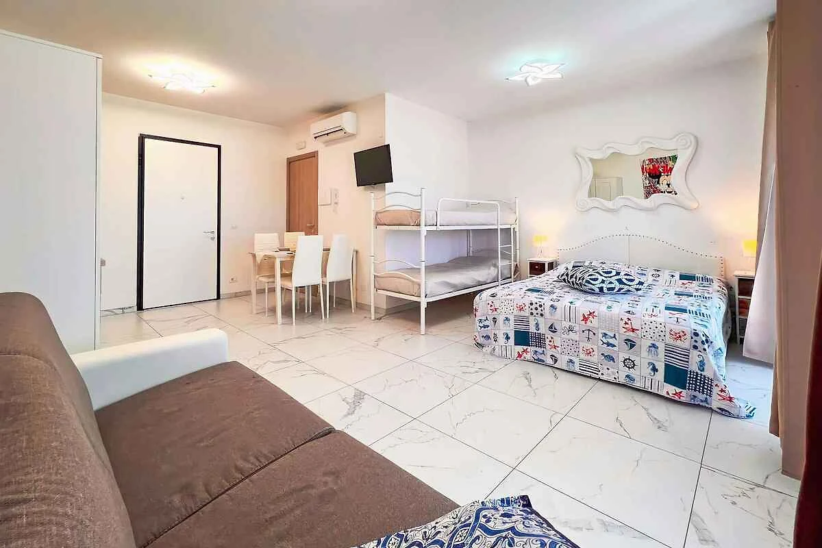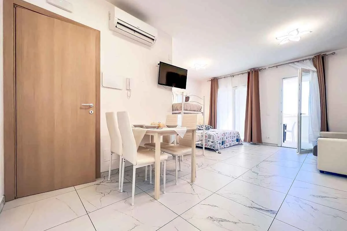Der Eingang in Ihr Studio befindet sich im Obergeschoss und führt direkt in das Wohn/Schlafzimmer. Kochnische im Wohn/Schlafzimmer mit Essecke (4 Plätze), Elektroherd (4 Platten), Backofen, Kühlschrank (Eisfach) und Mikrowelle. Bad mit Dusche, 1 Waschbecken, WC und Bidet. Wohn/Schlafzimmer mit 1 Doppelbett, 2 Zusatzbetten auf Doppelausziehcouch, 1 Etagenbett, TV und Zugang zum Balkon.