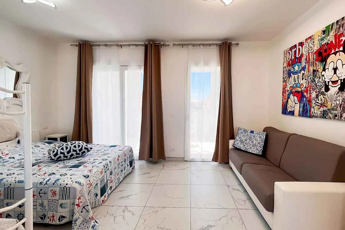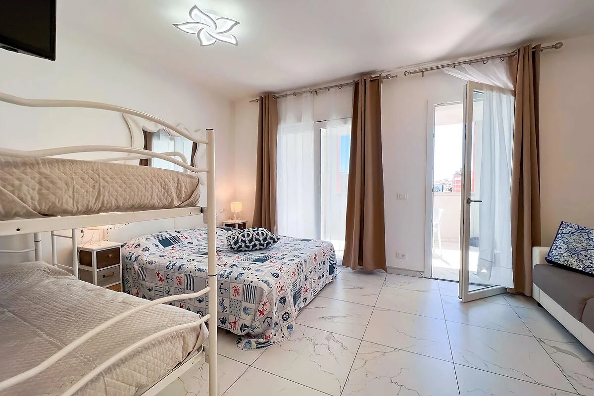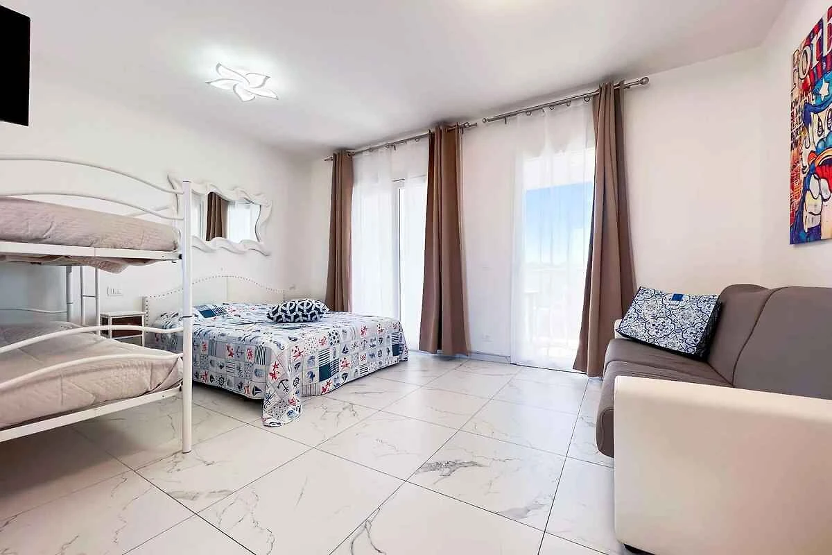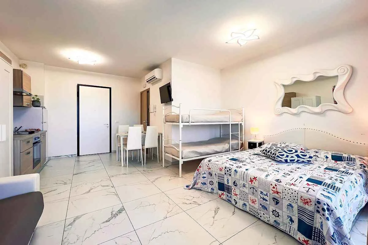 Der Eingang in Ihr Studio befindet sich im Obergeschoss und führt direkt in das Wohn/Schlafzimmer. Kochnische im Wohn/Schlafzimmer mit Essecke (4 Plätze), Elektroherd (4 Platten), Backofen, Kühlschrank (Eisfach) und Mikrowelle. Bad mit Dusche, 1 Waschbecken, WC und Bidet. Wohn/Schlafzimmer mit 1 Doppelbett, 2 Zusatzbetten auf Doppelausziehcouch, 1 Etagenbett, TV und Zugang zum Balkon.