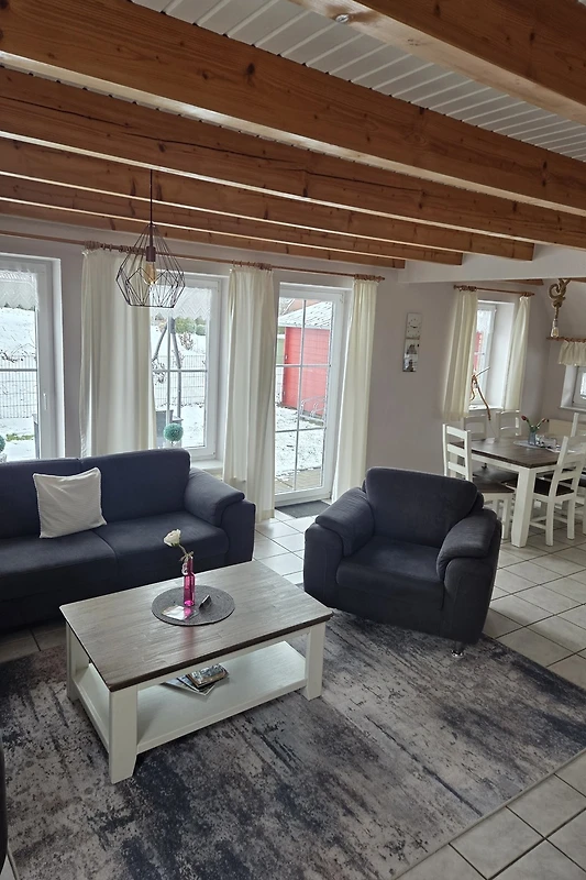 Das Wohnzimmer ist der perfekte Ort zum Entspannen. Es ist mit bequemen Möbeln und Fliesen ausgestattet. Die großen Fenster bieten einen schönen Blick auf die Umgebung.