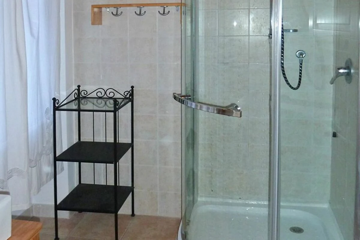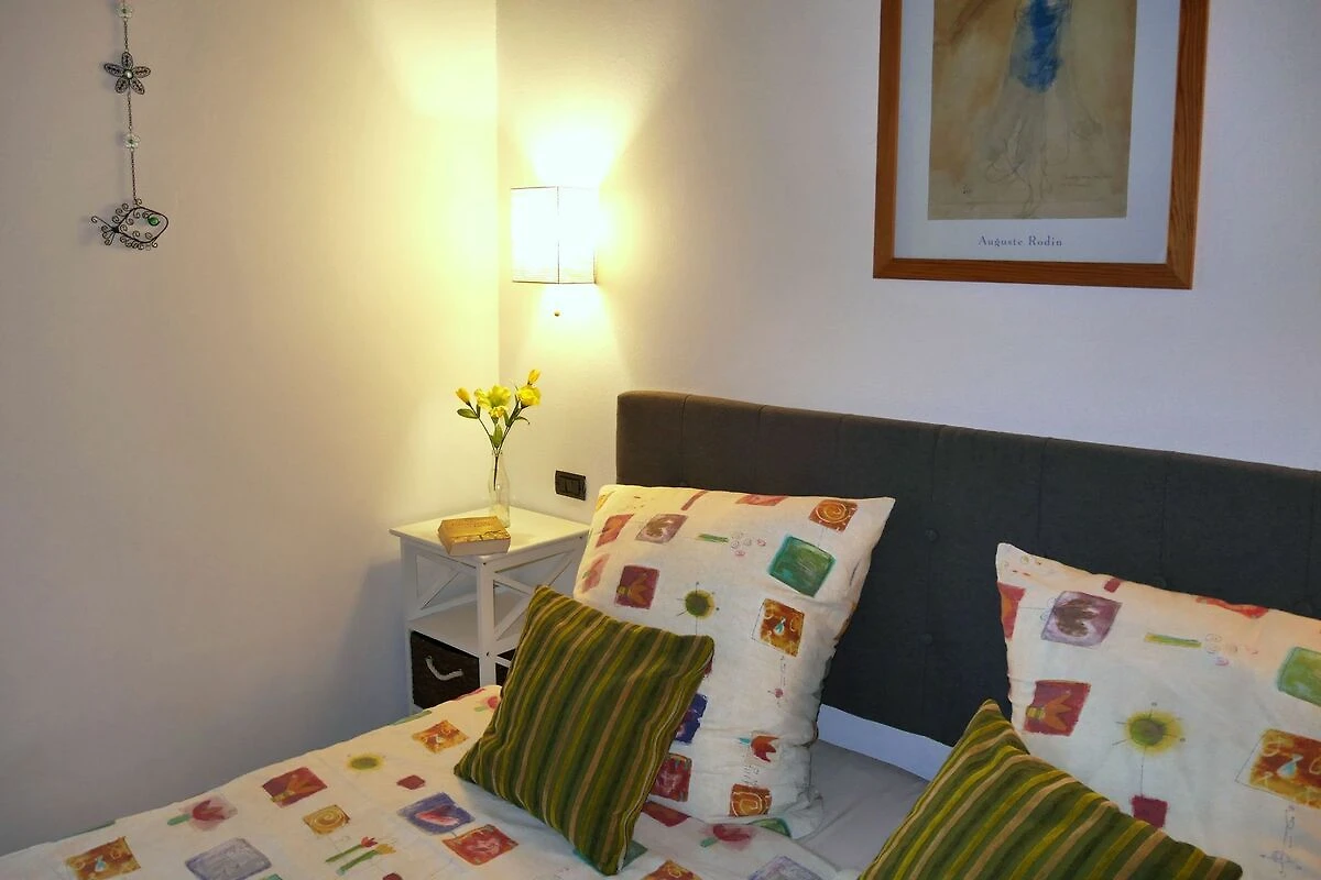 Im Obergeschoss erwarten die Gäste 2 Schlafzimmer und das helle Bad mit Dusche. Gemütlich wird es durch die Holzbalkendecken und die freundliche Möblierung.