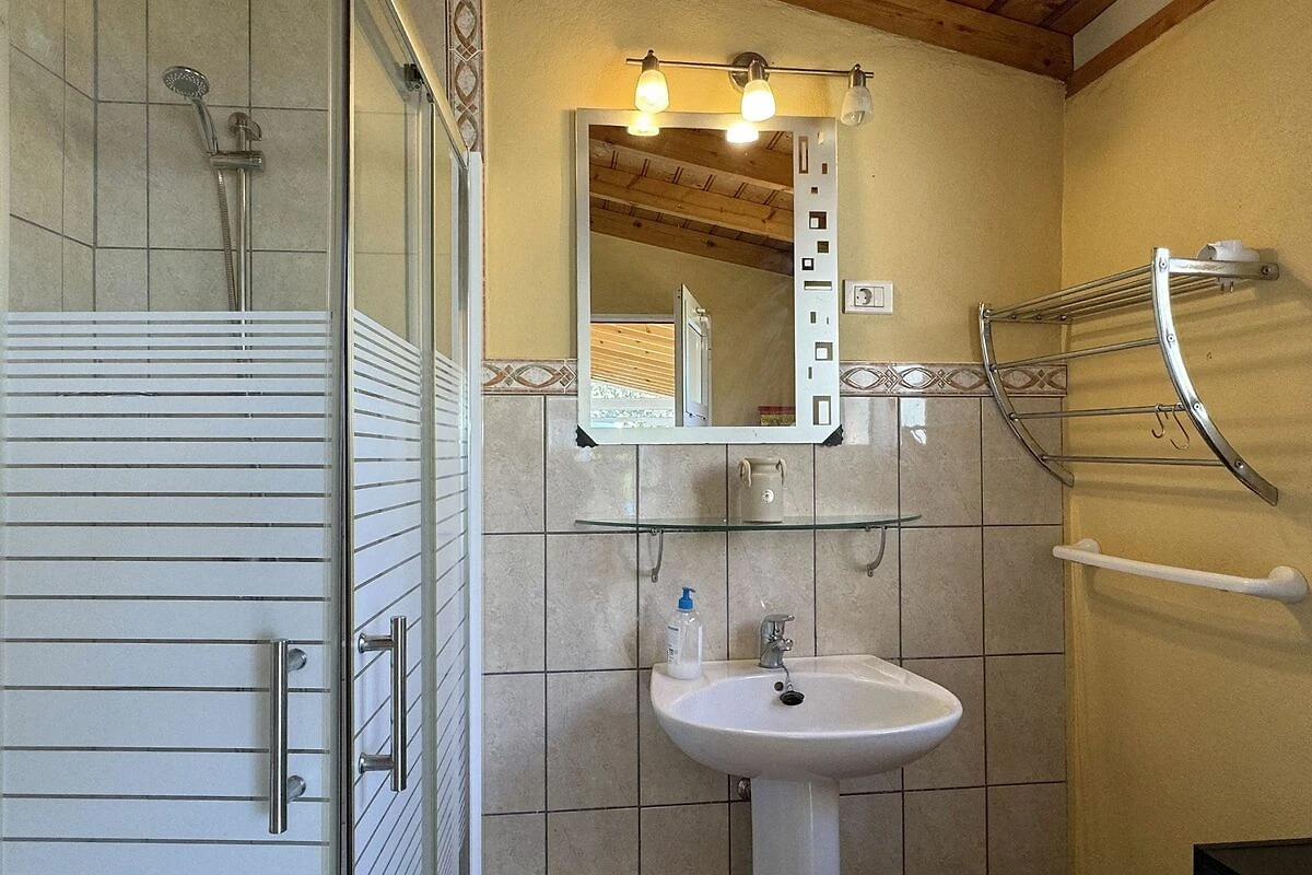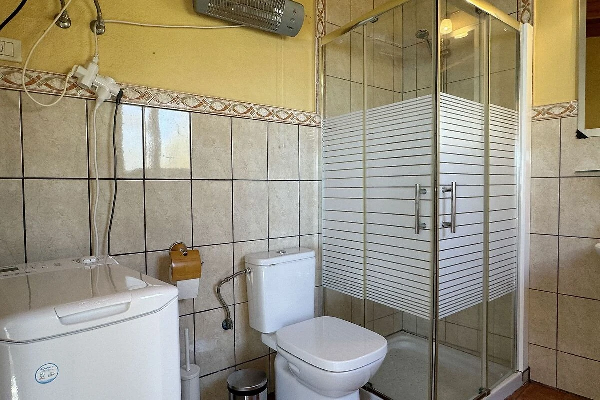 Im Bad finden Sie Dusche, Waschbecken, WC, einen kleinen Abstellschrank und Waschmaschine sowie einen Heizstrahler vor.