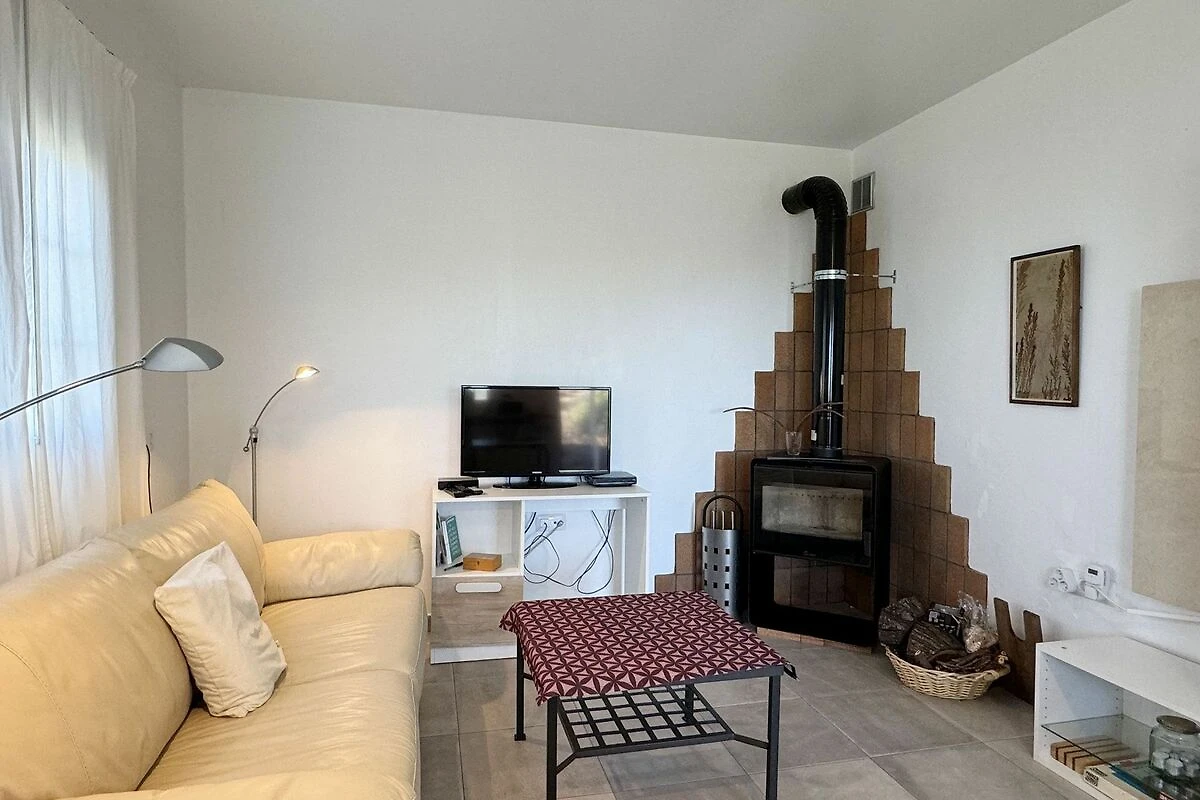Den Mittelpunkt des Hauses bildet der Wohnraum mit Küchenzeile, kleinem Esstisch , einem grossen Sofa, SAT TV sowie einer Römer Heizung. Ein gemütlicher Holzofen mit Sichtfenster sorgt für behagliche Abende. Kaminholz wird gestellt.