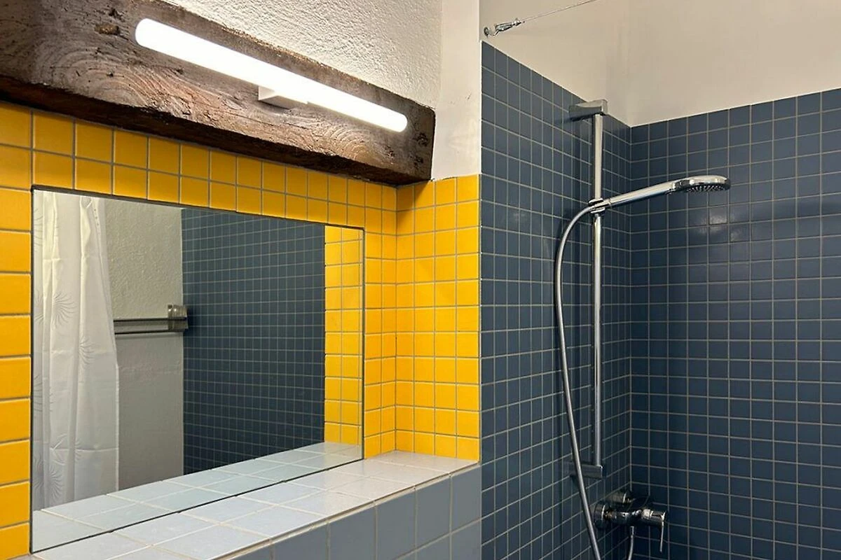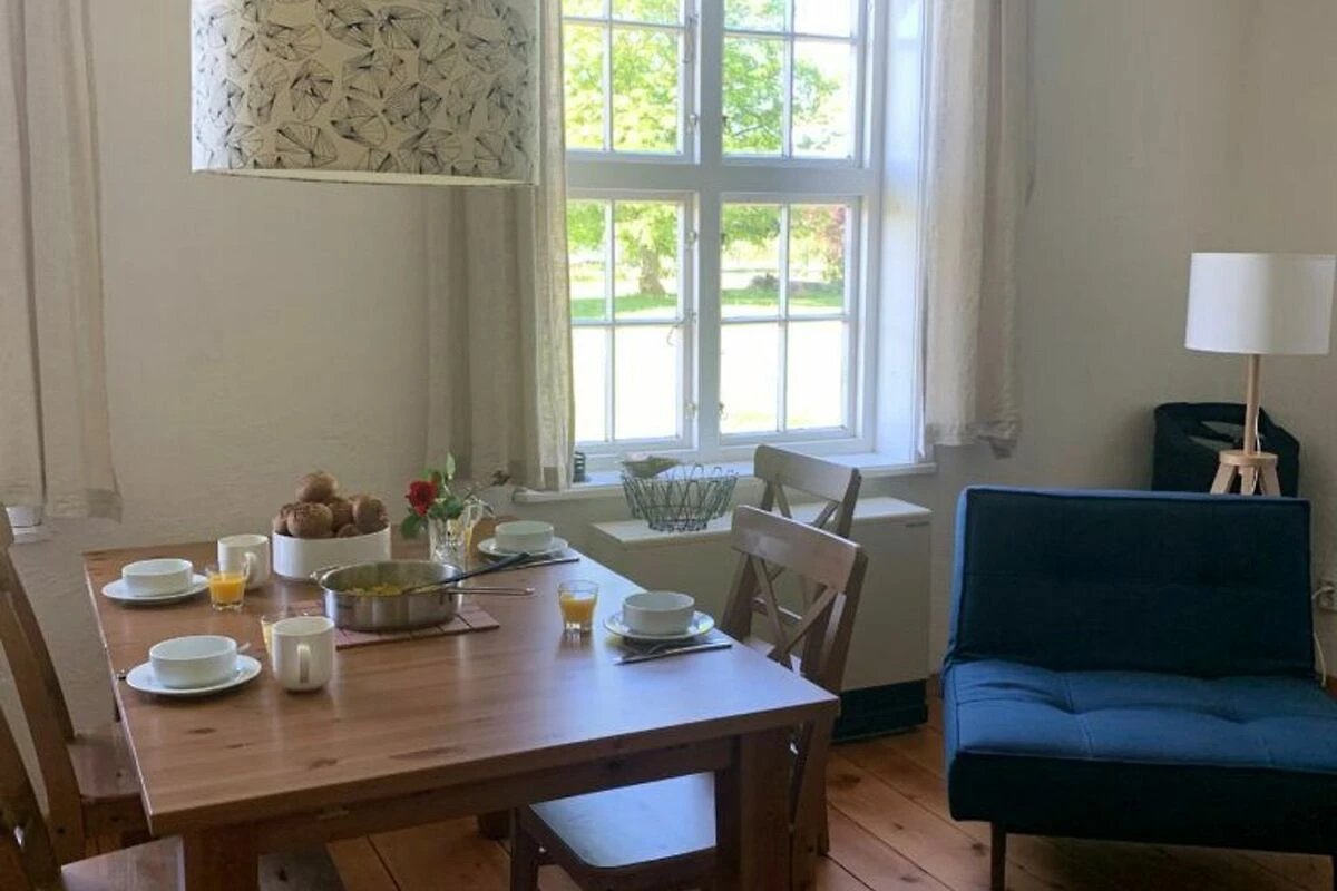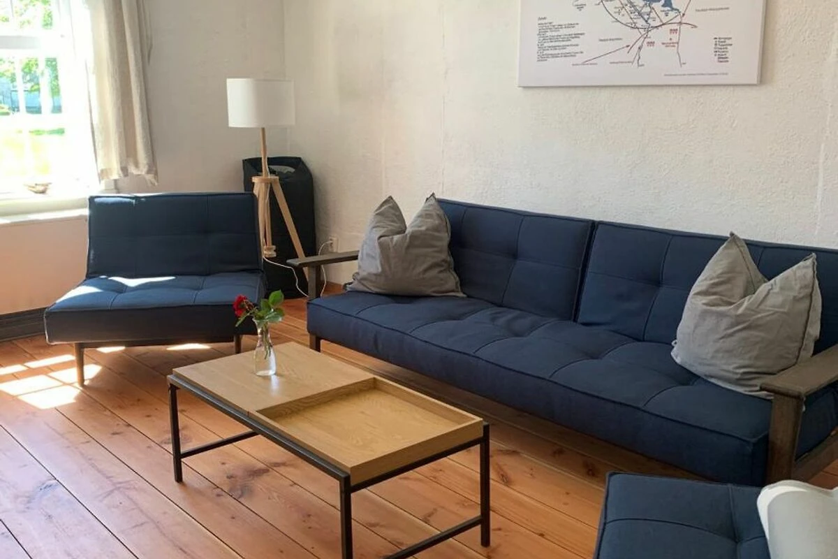 Die Fewo 2 besteht aus einem geräumigen Wohnzimmer mit offener Küche, hohen Decken, grossen Fenstern und alten Holzdielen sowie einem Schlafzimmer mit Queensize-Doppelbett und einem Bad mit Dusche und WC. Die voll ausgestattete Küche bietet viel Platz für gemeinsames und kommunikatives Kochen. In dieser Wohnung können 2 Personen im Schlafzimmer und 2 Personen im Wohnzimmer auf einem breiten, gemütlichem Sofa mit Topper übernachten. So ist die Wohnung für 4 Personen geeignet.