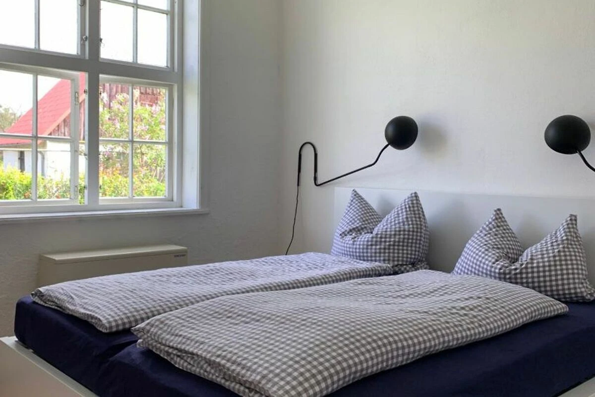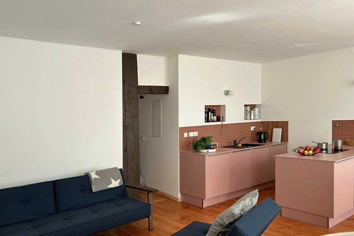 Die Fewo 2 besteht aus einem geräumigen Wohnzimmer mit offener Küche, hohen Decken, grossen Fenstern und alten Holzdielen sowie einem Schlafzimmer mit Queensize-Doppelbett und einem Bad mit Dusche und WC. Die voll ausgestattete Küche bietet viel Platz für gemeinsames und kommunikatives Kochen. In dieser Wohnung können 2 Personen im Schlafzimmer und 2 Personen im Wohnzimmer auf einem breiten, gemütlichem Sofa mit Topper übernachten. Demnach insgesamt für 4 Personen geeignet.
