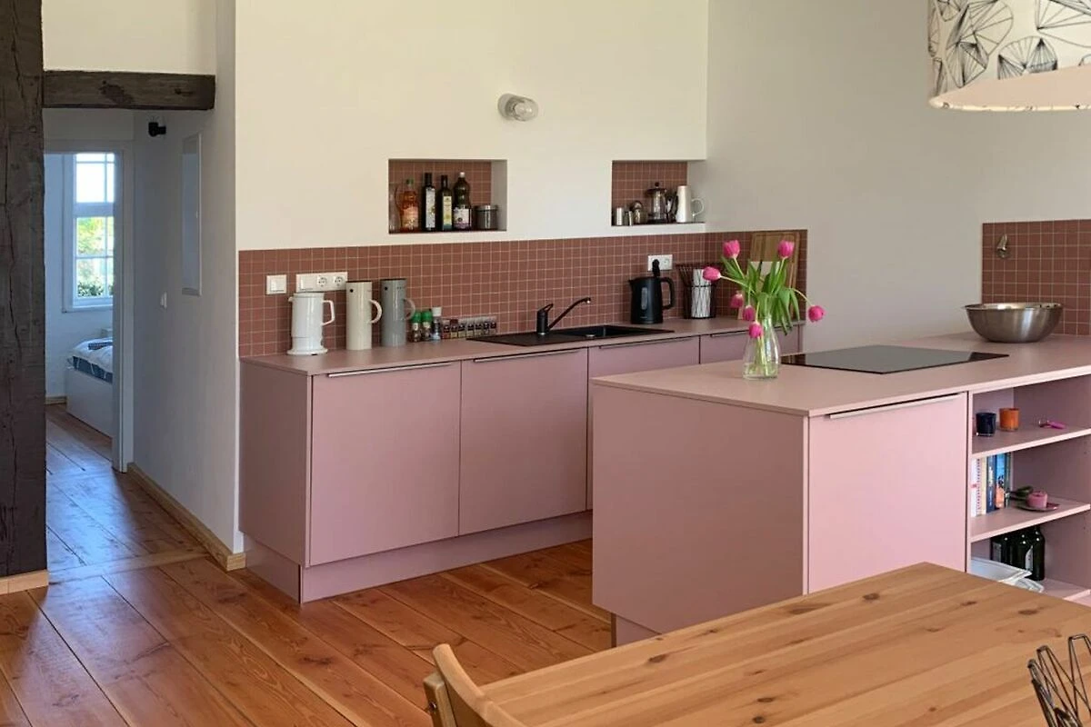Zwischen den beiden grossen Wohnungen (Fewo 2 & 3) liegt ein 40qm grosser Gemeinschaftsraum mit Küche und WC, der zum gemeinsamen Essen, Arbeiten, Spielen und für Gruppenaktivitäten genutzt werden kann. Ein Schlafsofa bietet hier zudem 2 zusätzliche Schlafgelegenheiten.