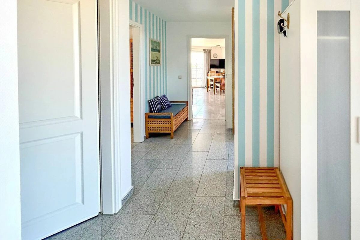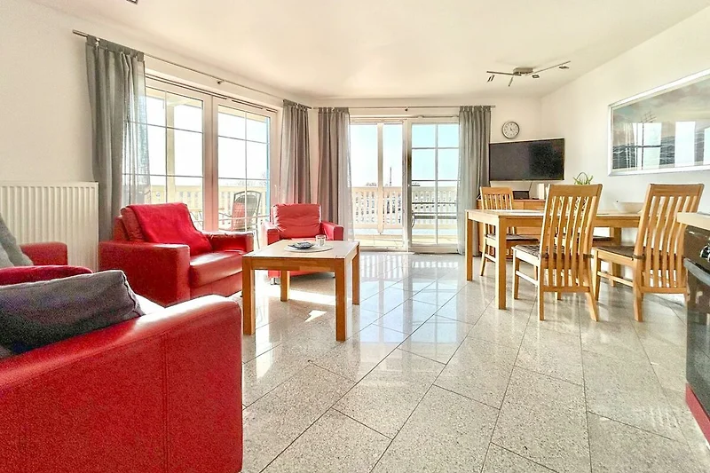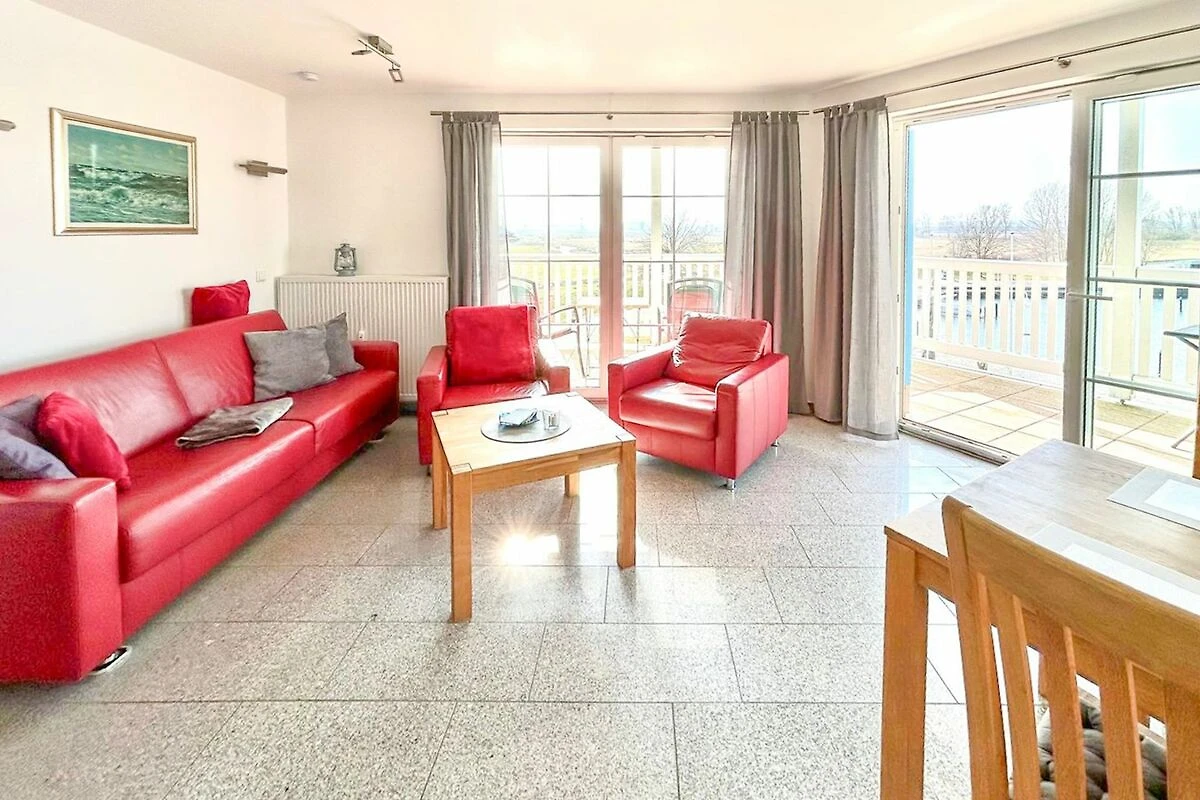 Gemütlich eingerichtete Ferienwohnung mit Blick auf den Yachthafen von Karlshagen, für bis zu 3 Personen. Sie verfügt über einen hellen Wohnbereich mit bodentiefen Fenstern zum Hafenbalkon, eine Couchgarnitur, einen Essbereich, Smart-TV, WLAN und eine gut ausgestattete Küchenzeile.