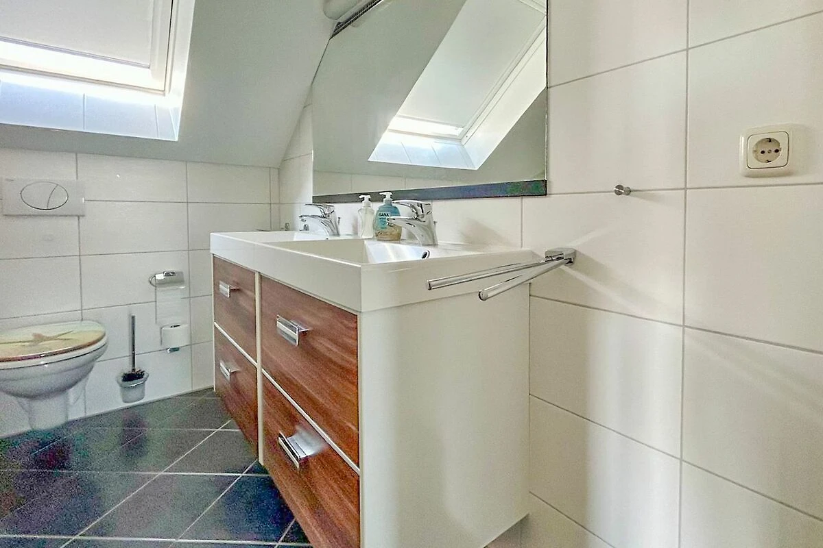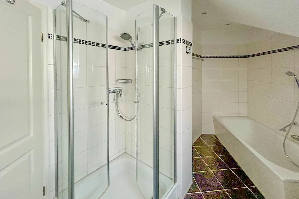 Im Badezimmer befinden sich Dusche, Badewanne, ein Doppelwaschtisch sowie ein WC.