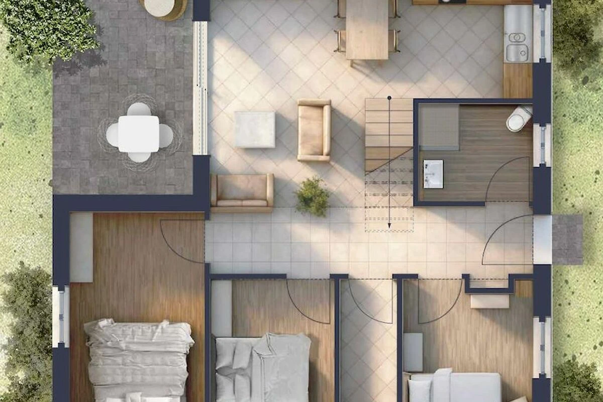 Es bietet einen grossen Wohne/ Ess.- Bereich mit offener Küche und bis zu 3 Schlafzimmern.
