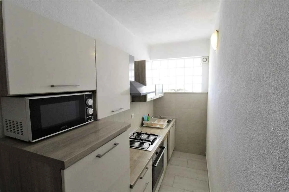 Wohnzimmer mit Sitzecke, TV, Klimaanlage, Essecke und Zugang zur Terrasse. Schlafzimmer mit 1 Einzelbett. Schlafzimmer mit 2 Kinderbetten. Schlafzimmer mit 1 Doppelbett. Küche mit Gasherd, Backofen, Kühlschrank (Eisfach), Mikrowelle und Kaffeemaschine. Bad mit Waschmaschine, Dusche, 1 Waschbecken und WC.