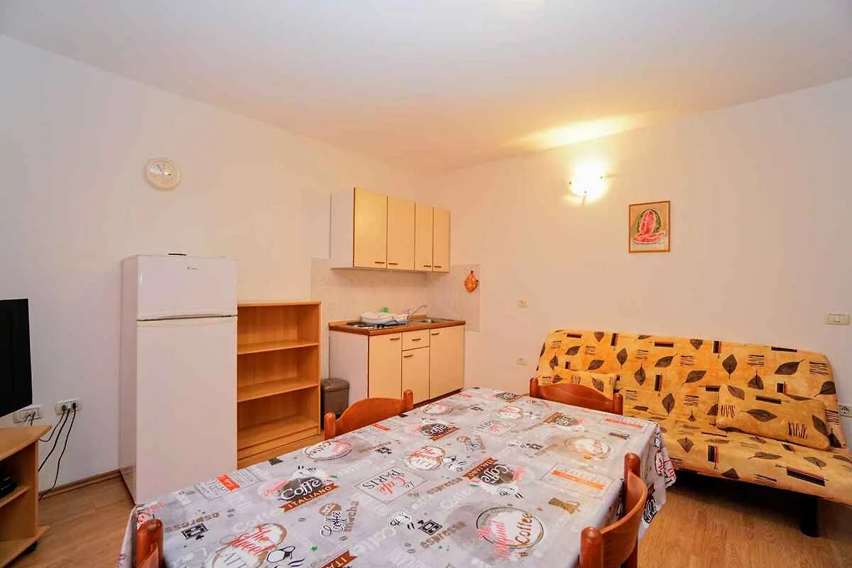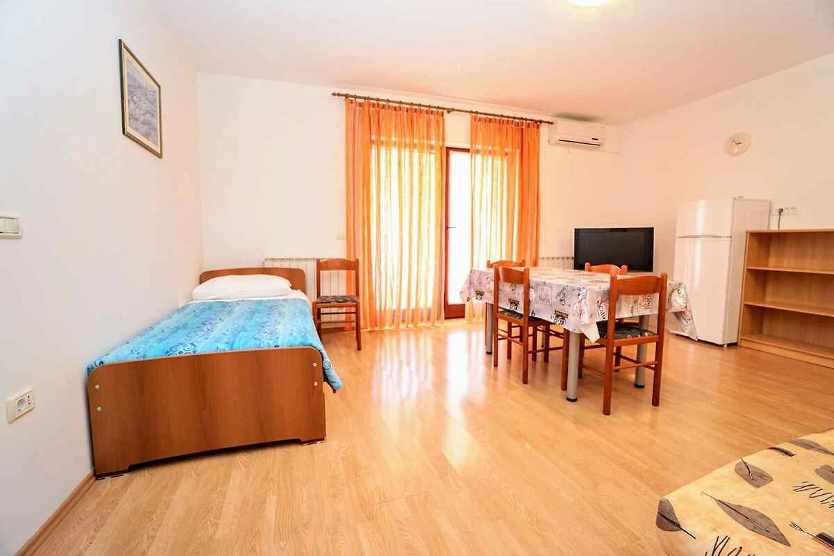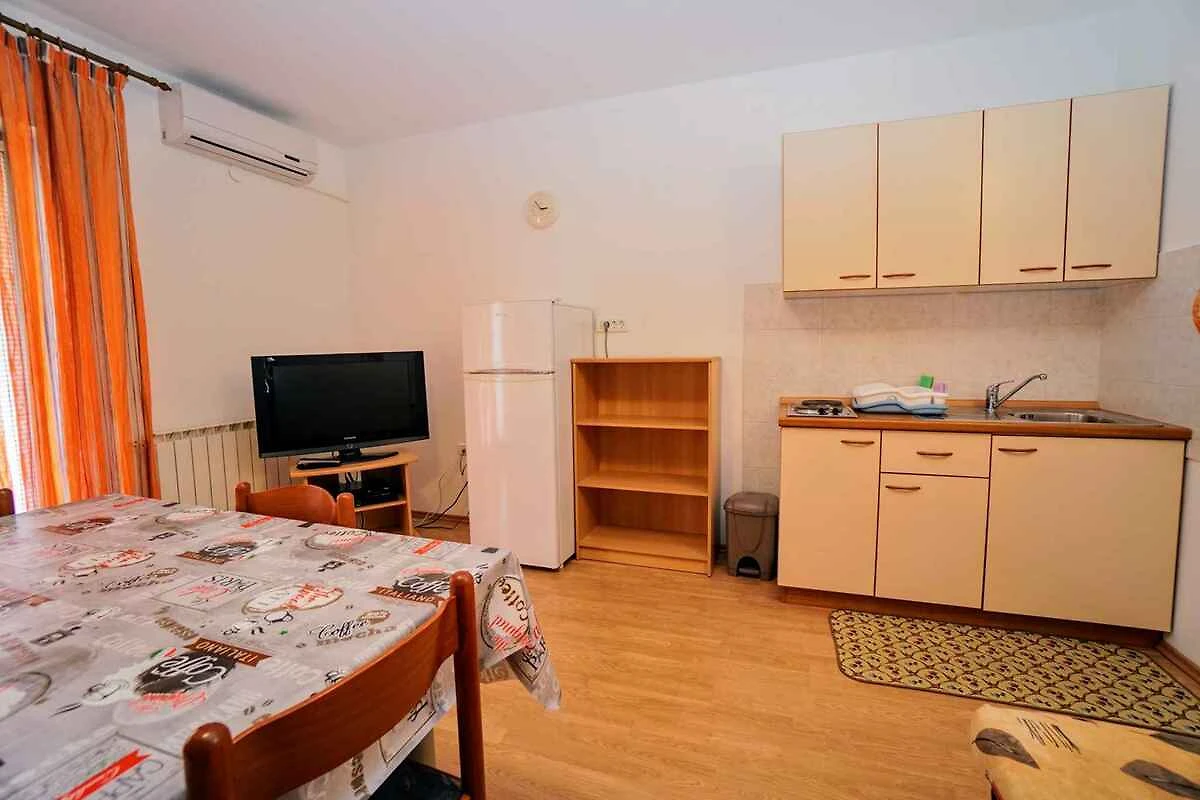 Wohn/Schlafzimmer mit 2 Zusatzbetten auf Couch/Sofa, TV, Klimaanlage und Zugang zum Balkon (Gartenmöbel). Schlafzimmer mit 1 Doppelbett. Kochecke im Wohn/Schlafzimmer mit Elektroherd (Cerankochfeld), Kühlschrank (Eisfach) und Kaffeemaschine. Bad mit Dusche, 1 Waschbecken und WC.