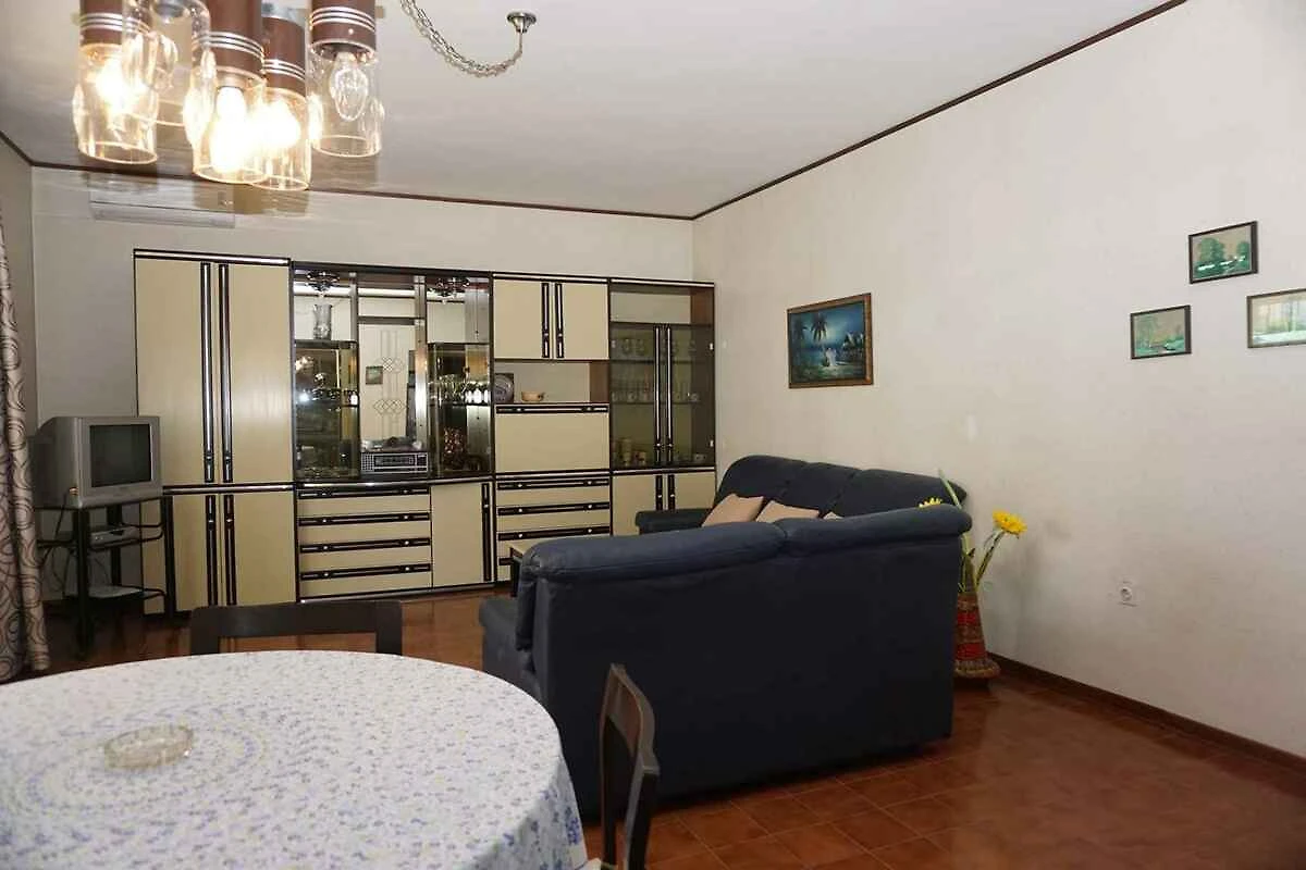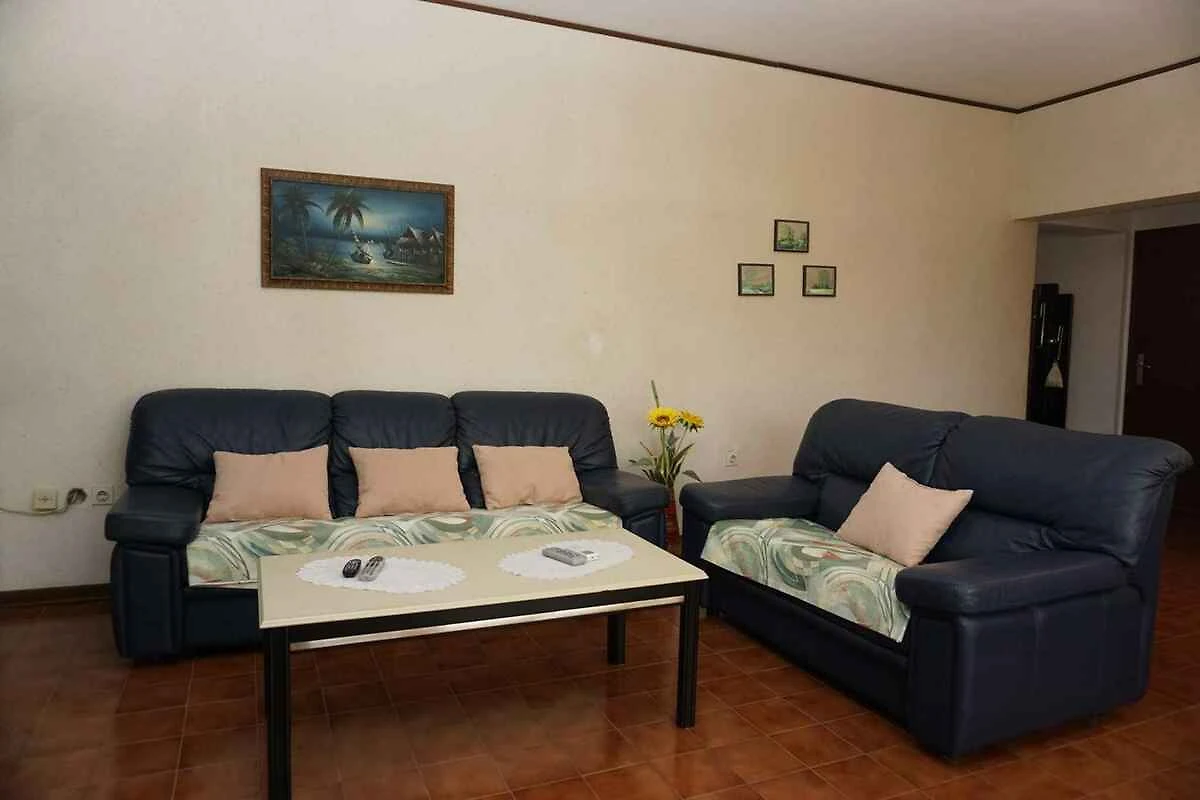 und führt direkt in das Wohnzimmer. Wohnzimmer mit 2 Kinderbetten, Sitzecke, TV, Essecke und Zugang zum Balkon. Schlafzimmer mit 1 Doppelbett. Küche mit Gasherd, Backofen, Kühlschrank und Mikrowelle. Bad mit Badewanne, 1 Waschbecken und WC.