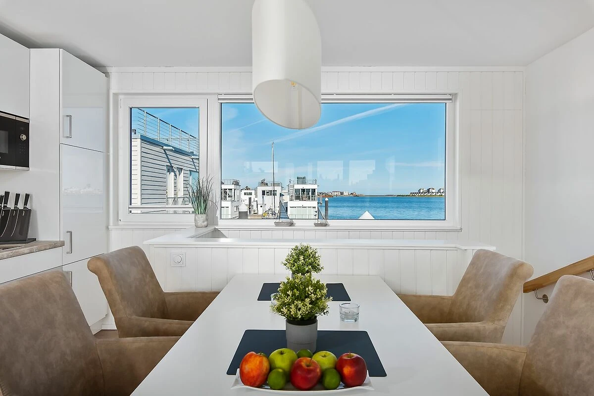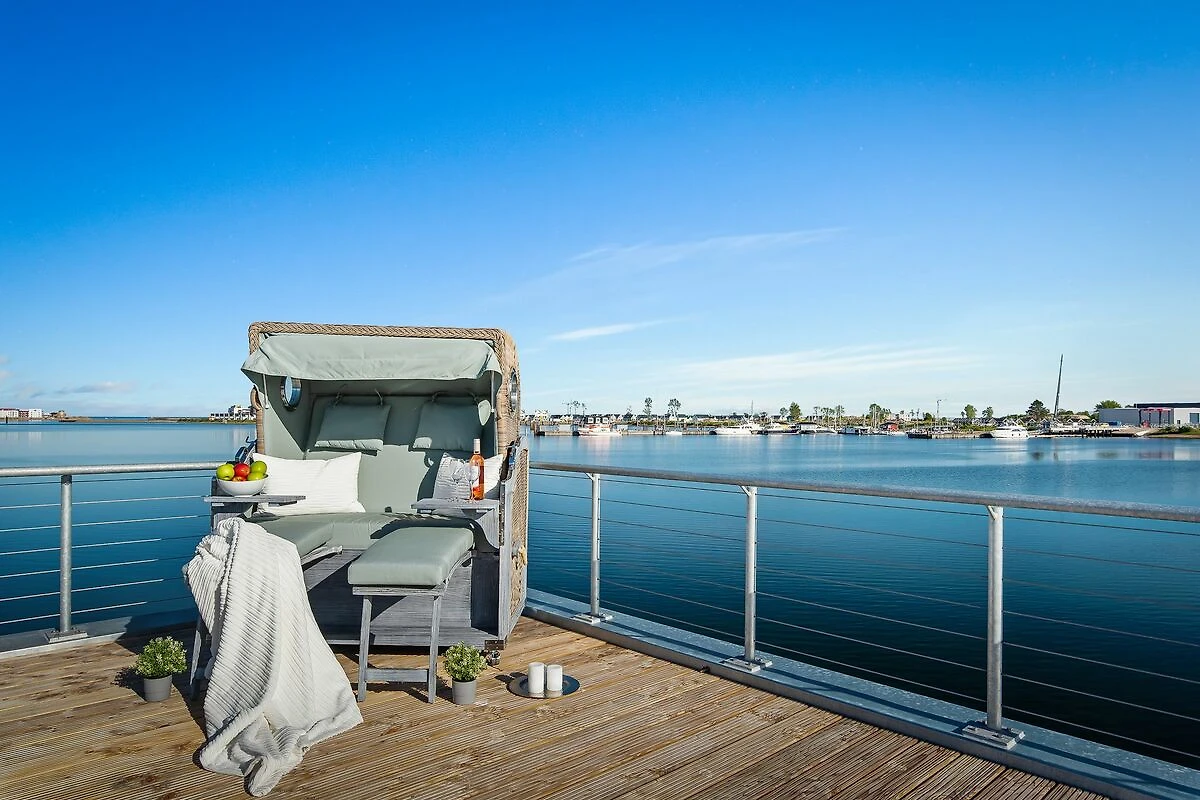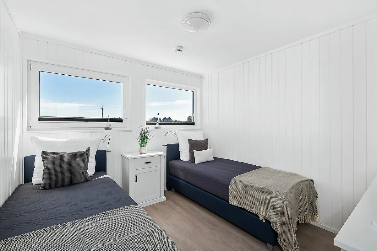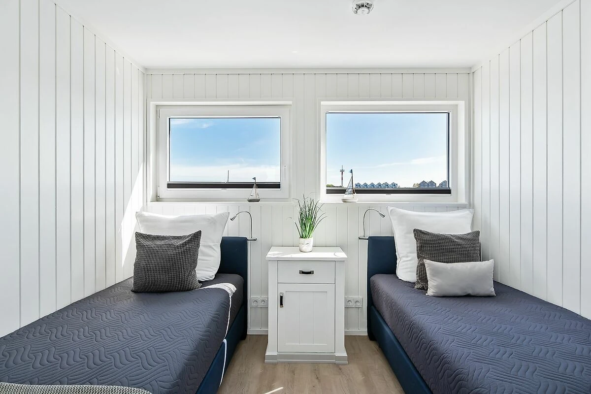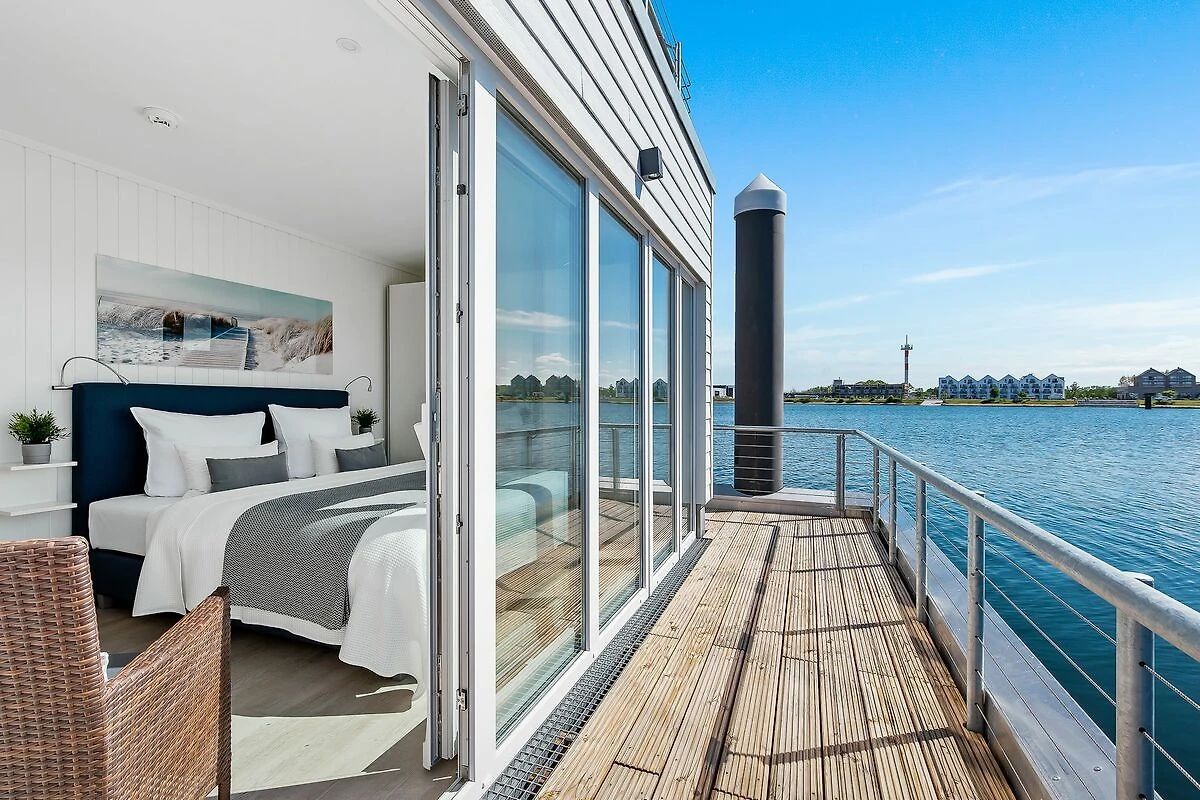 Willkommen an Bord – Ihr Ostsee-Urlaub startet jetzt im schwimmenden Ferienhaus "Blau im Meer"! Auf großzügigen 97m² erwartet Sie ein Wohlfühlparadies, das keine Wünsche offenlässt. Ein lichtdurchfluteter Wohn- und Essbereich, zwei traumhafte Schlafzimmer, ein modernes Badezimmer und eine Dachterrasse, die Ihnen einen atemberaubenden 360-Grad-Panoramablick aufs Wasser bietet. Machen Sie es sich im gemütlichen Wohnbereich bequem und lassen Sie den Tag bei einer fesselnden Serie oder einem guten Buch entspannt ausklingen. Die voll ausgestattete Küche lädt dazu ein, kulinarische Meisterwerke zu zaubern, und am Esstisch können Sie gesellige Spieleabende verbringen – die hauseigenen Spiele stehen schon bereit! Die beiden Schlafzimmer sind wahre Wohlfühloasen. Das erste Zimmer bietet Ihnen zwei komfortable Boxspring-Einzelbetten (je 100x200cm), Verdunkelungsmöglichkeiten und einen Flachbildfernseher. Im zweiten Schlafzimmer erwartet Sie ein großzügiges Boxspring-Doppelbett (180x200cm), Verdunkelungsmöglichkeiten und ein Kleiderschrank. Von hier aus können Sie direkt auf die Terrasse treten und den Blick über das Wasser genießen – starten Sie den Tag mit einer Tasse Kaffee und dieser grandiosen Aussicht! Falls Freunde oder Familie bei Ihnen übernachten möchten, verwandelt sich das Sofa im Wohnbereich im Handumdrehen in einen bequemen Schlafplatz. Das moderne Badezimmer bietet alles, was Sie für Ihr Wohlbefinden brauchen – eine ebenerdige Dusche, einen Handtuchheizkörper und einen Föhn. Sogar eine Finnische Sauna befindet sich im Haus, die Wellness pur verspricht. Die Krönung des Ganzen ist die spektakuläre Dachterrasse. Hier erleben Sie unvergessliche Momente bei traumhaften Sonnenuntergängen, ob Sie über das Hafenbecken und die Marina des OstseeResorts blicken oder den Blick über die Ostsee und Schleimünde schweifen lassen. Sonnige Tage laden zu ausgedehnten Sonnenbädern und entspannten Grillabenden ein. Seefahrer aufgepasst: Direkt am Haus erwartet Sie ein eigener Liegeplatz mit Zugang zu Strom und Wasser sowie eine Badeleiter. Für Autofahrer steht ein kostenfreier Stellplatz direkt am Steg bereit. Ihr unvergesslicher Traumurlaub beginnt hier und jetzt – willkommen im "Blau im Meer"!