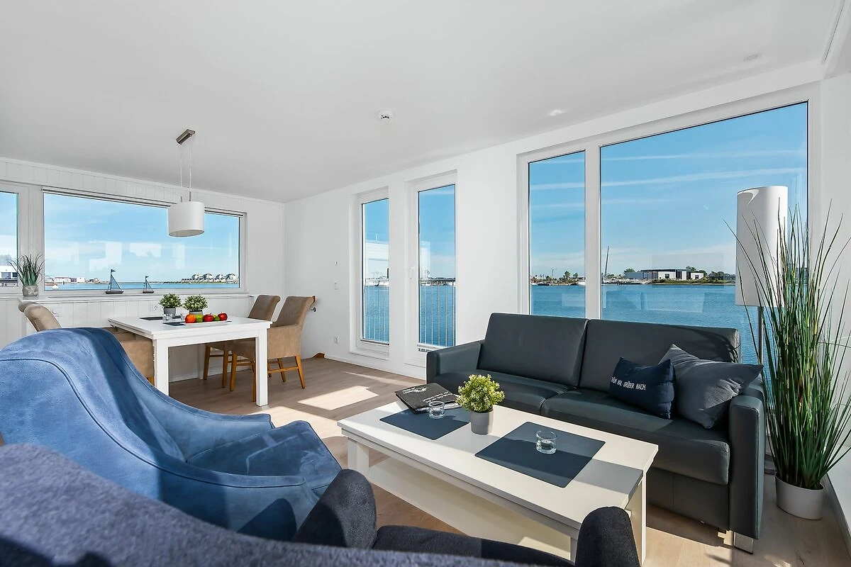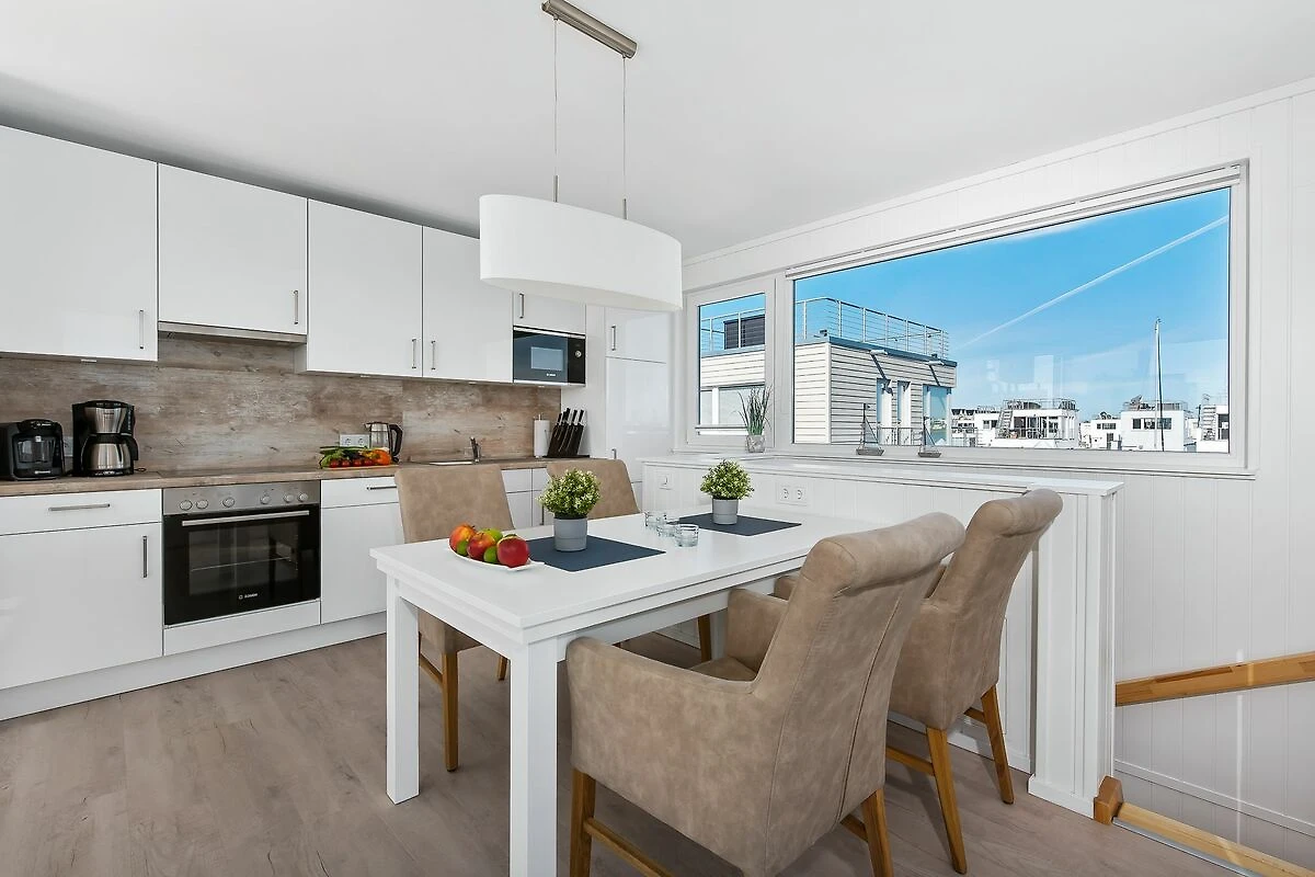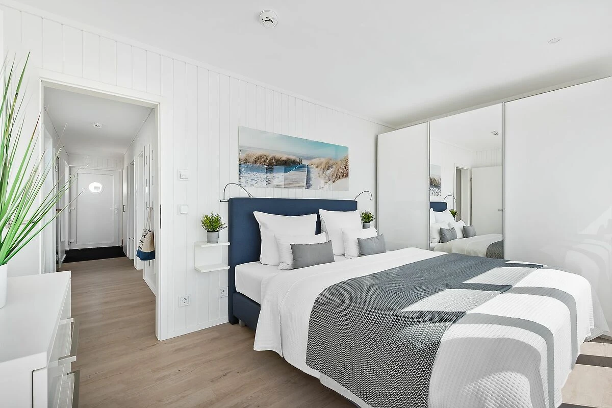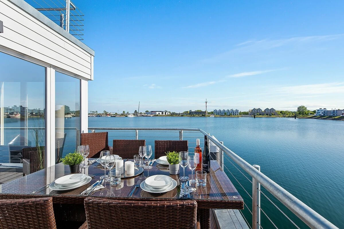 Willkommen an Bord – Ihr Ostsee-Urlaub startet jetzt im schwimmenden Ferienhaus "Blau im Meer"! Auf großzügigen 97m² erwartet Sie ein Wohlfühlparadies, das keine Wünsche offenlässt. Ein lichtdurchfluteter Wohn- und Essbereich, zwei traumhafte Schlafzimmer, ein modernes Badezimmer und eine Dachterrasse, die Ihnen einen atemberaubenden 360-Grad-Panoramablick aufs Wasser bietet. Machen Sie es sich im gemütlichen Wohnbereich bequem und lassen Sie den Tag bei einer fesselnden Serie oder einem guten Buch entspannt ausklingen. Die voll ausgestattete Küche lädt dazu ein, kulinarische Meisterwerke zu zaubern, und am Esstisch können Sie gesellige Spieleabende verbringen – die hauseigenen Spiele stehen schon bereit! Die beiden Schlafzimmer sind wahre Wohlfühloasen. Das erste Zimmer bietet Ihnen zwei komfortable Boxspring-Einzelbetten (je 100x200cm), Verdunkelungsmöglichkeiten und einen Flachbildfernseher. Im zweiten Schlafzimmer erwartet Sie ein großzügiges Boxspring-Doppelbett (180x200cm), Verdunkelungsmöglichkeiten und ein Kleiderschrank. Von hier aus können Sie direkt auf die Terrasse treten und den Blick über das Wasser genießen – starten Sie den Tag mit einer Tasse Kaffee und dieser grandiosen Aussicht! Falls Freunde oder Familie bei Ihnen übernachten möchten, verwandelt sich das Sofa im Wohnbereich im Handumdrehen in einen bequemen Schlafplatz. Das moderne Badezimmer bietet alles, was Sie für Ihr Wohlbefinden brauchen – eine ebenerdige Dusche, einen Handtuchheizkörper und einen Föhn. Sogar eine Finnische Sauna befindet sich im Haus, die Wellness pur verspricht. Die Krönung des Ganzen ist die spektakuläre Dachterrasse. Hier erleben Sie unvergessliche Momente bei traumhaften Sonnenuntergängen, ob Sie über das Hafenbecken und die Marina des OstseeResorts blicken oder den Blick über die Ostsee und Schleimünde schweifen lassen. Sonnige Tage laden zu ausgedehnten Sonnenbädern und entspannten Grillabenden ein. Seefahrer aufgepasst: Direkt am Haus erwartet Sie ein eigener Liegeplatz mit Zugang zu Strom und Wasser sowie eine Badeleiter. Für Autofahrer steht ein kostenfreier Stellplatz direkt am Steg bereit. Ihr unvergesslicher Traumurlaub beginnt hier und jetzt – willkommen im "Blau im Meer"!