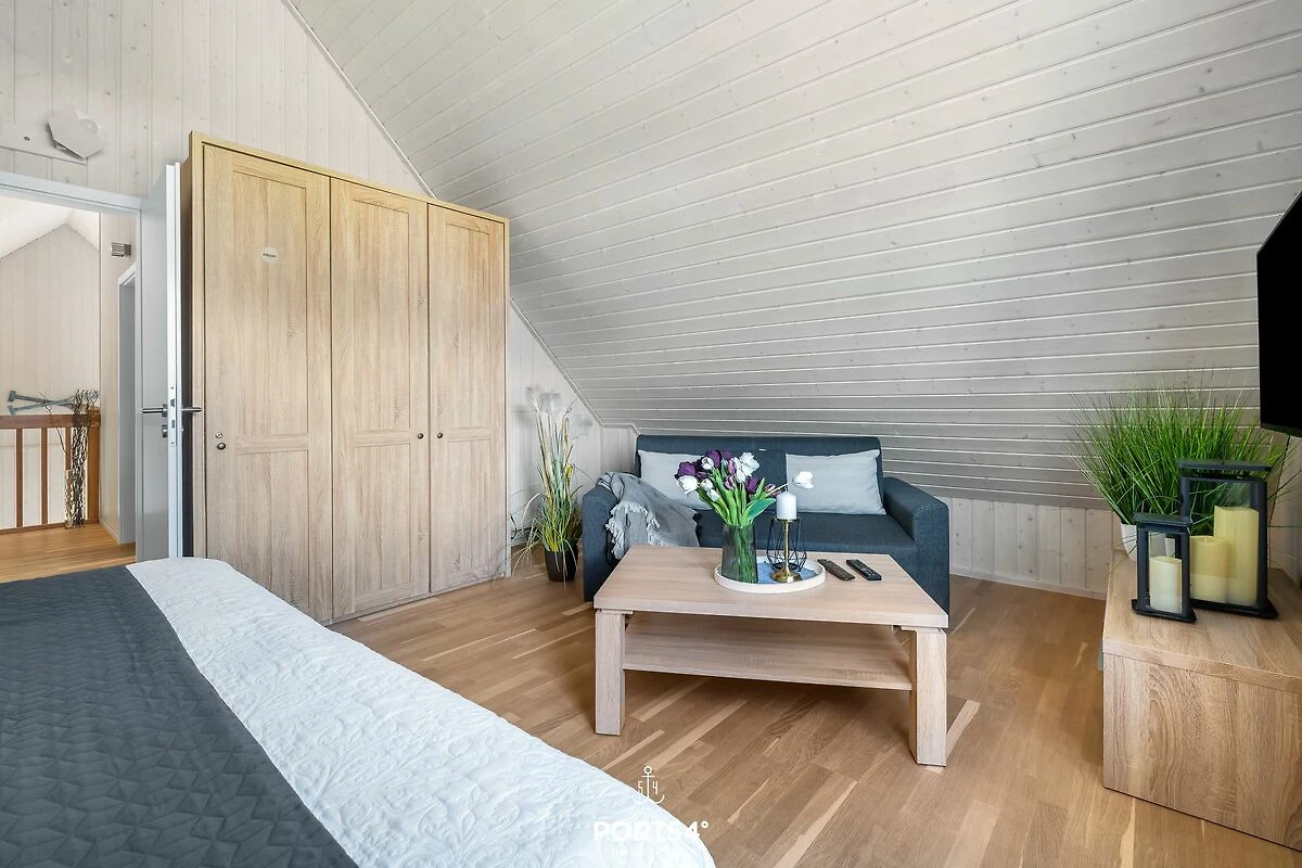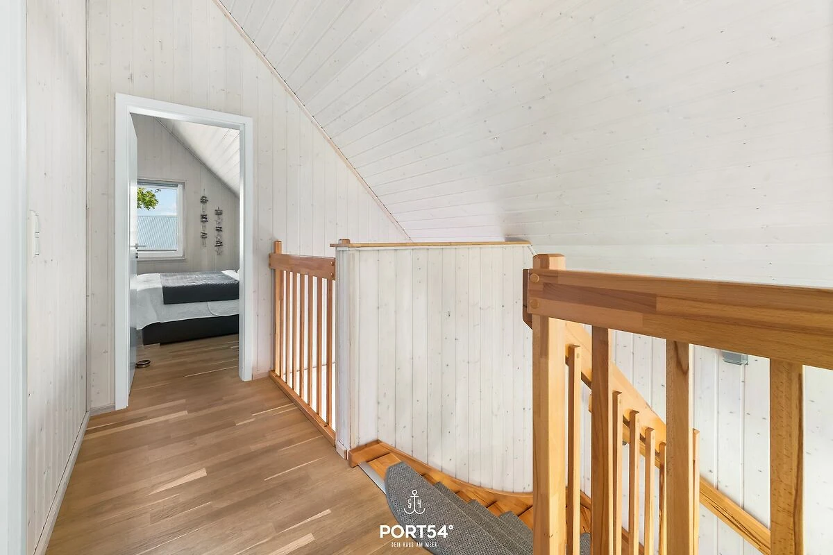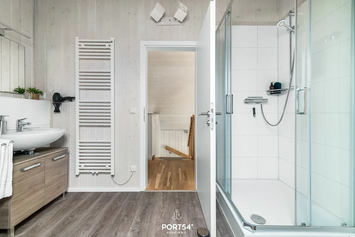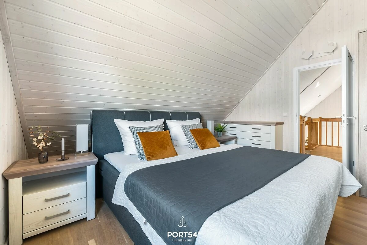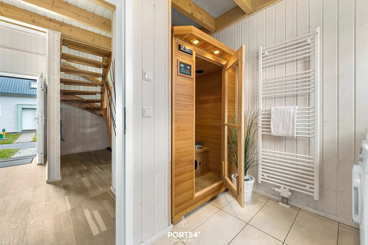 Willkommen in Ihrem Feriendomizil "Sanfte Brise" in Olpenitz. Im Erdgeschoss befindet sich der große, loftartig angelegte Wohn- und Essbereich, zwei Schlafzimmer sowie ein Badezimmer. Ein weiteres Bad und ein Schlafzimmer finden Sie im Obergeschoss. Die hohen Decken und die großen Fenster sorgen für besonders viel Lichteinfall und ein großzügiges Wohngefühl. Das 98m² große, freistehende Haus besticht durch seine Lage im Grünen und der unmittelbaren Nähe zur Ostsee. Nach langen Strandspaziergängen können Sie auf dem gemütlichen Sofa vor dem Kamin entspannen oder Ihre Lieblingsserie über den vorhandenen Blu-ray-Player auf dem Flachbild-TV schauen. Für die Kleinen stehen zwei Kinderreisebetten und zwei Kinderhochstühle bereit. Die voll ausgestattete Küche bietet alles, was Sie für einen geselligen Kochabend mit der Familie benötigen. Ein Schlafzimmer im Erdgeschoss ist mit einem Doppelbett (180x200cm) und einem Flachbild-TV ausgestattet, das andere verfügt über zwei Einzelbetten (je 90x200cm). Im dritten Schlafzimmer im Obergeschoss finden Sie ein Doppelbett (180x200cm), ein zusätzliches Schlafsofa (160x200cm) sowie einen Smart-TV. Für erholsame Nächte sind alle Schlafzimmer mit Verdunkelungsmöglichkeiten und Fliegengittern ausgestattet. Das Badezimmer im Erdgeschoss ist mit einer Badewanne, einem Handtuchheizkörper, einer Waschmaschine und dem Highlight, einer Infrarot-Sauna ausgestattet. Hier können Sie sich an kalten Tagen aufwärmen und entspannen. Das weitere Badezimmer im ersten Obergeschoss bietet eine Dusche, ebenfalls einen Handtuchheizkörper, einen Wäschetrockner und einen Föhn. An sonnigen Tagen können Sie es sich auf der möblierten Terrasse gemütlich machen. Auf den Sonnenliegen können Sie ihre Urlaubstage genießen und an lauen Sommerabenden mit der Familie die Tage auf der Terrasse ausklingen lassen. Das Ferienhaus ist für maximal sechs Erwachsene und zwei Kinder vorgesehen, da die Schlafsofas 160cm breit sind. Ihr vierbeiniger Freund kann gerne mitreisen. Für Ihre PKW stehen zwei Stellplätze vor dem Haus zur Verfügung.