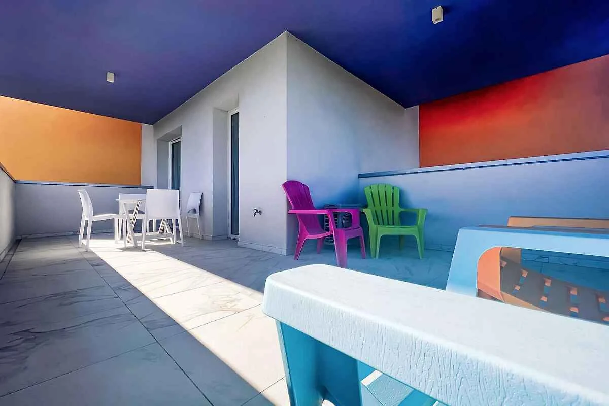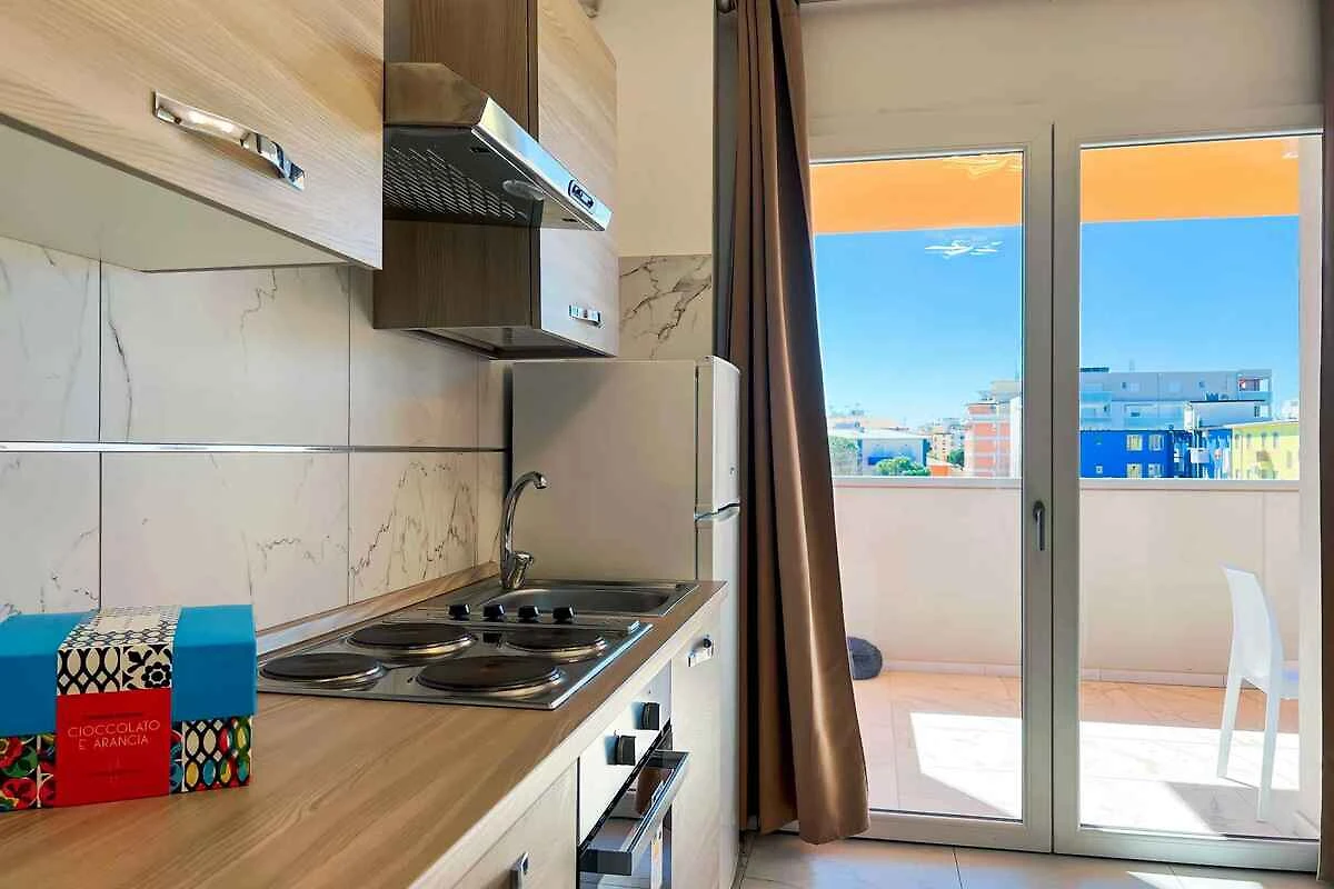 Bibione. Die Residenz befindet sich in Bibione Spiaggia in einer ruhigen Lage, nur 5 Gehminuten entfernt vom schönen Piazzale-Zenith-Strand und in der Nähe der Fussgängerzone des Abendspaziergangs mit allen Geschäften, Restaurants und Supermärkte. Das Gebäude liegt in der Nähe der Bushaltestelle, von wo aus es leicht ist den Venedig Flughafen "Marco Polo" oder die Kunststädten zu erreichen. Die Zufahrt erfolgt über einen Weg (asphaltiert). Parkplatz (für 1 Pkw) auf dem Grundstück.