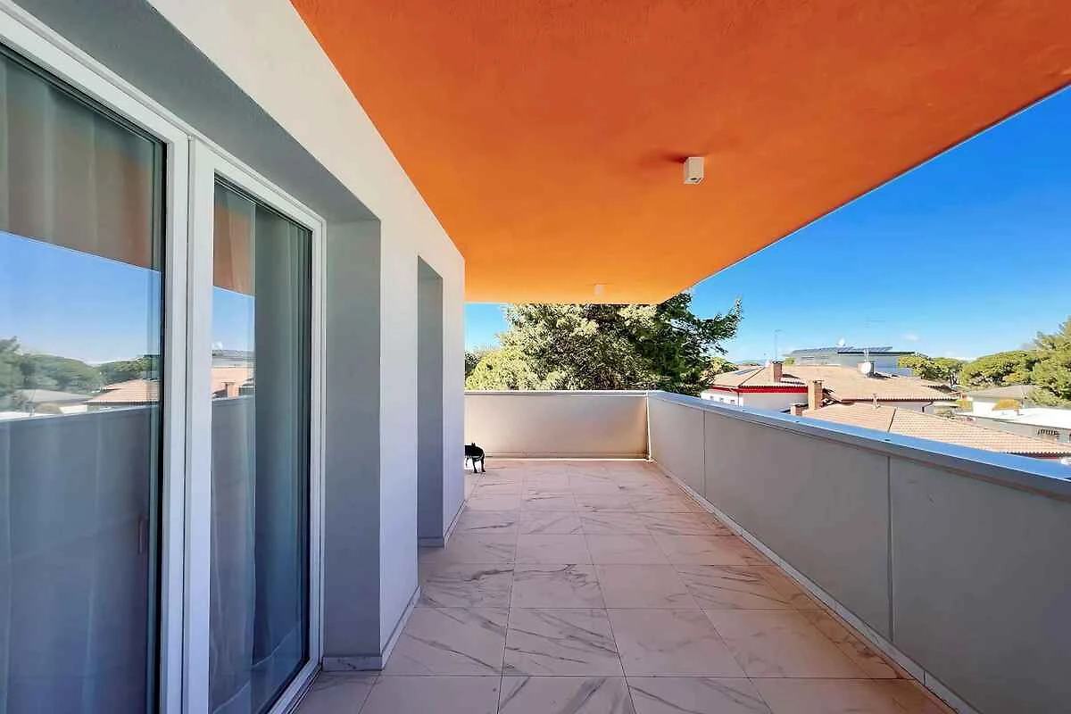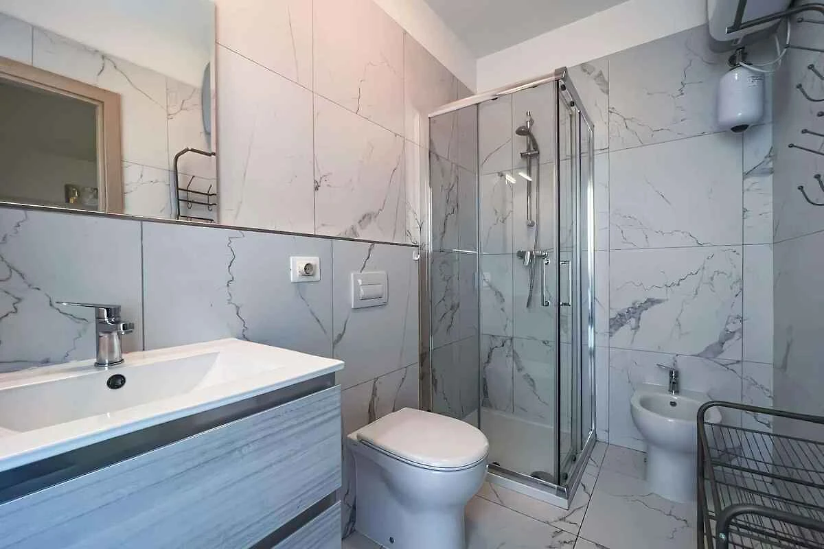 Wohn/Schlafzimmer mit 1 Doppelbett, 1 Einzelbett, 1 Zusatzbett auf Couch/Sofa, TV, Essecke und Zugang zum Balkon (überdacht, Gartenmöbel). Kochecke im Wohn/Schlafzimmer mit Elektroherd, Backofen, Kühlschrank und Mikrowelle. Bad mit Dusche, 1 Waschbecken, WC und Bidet.