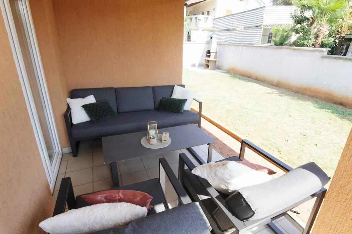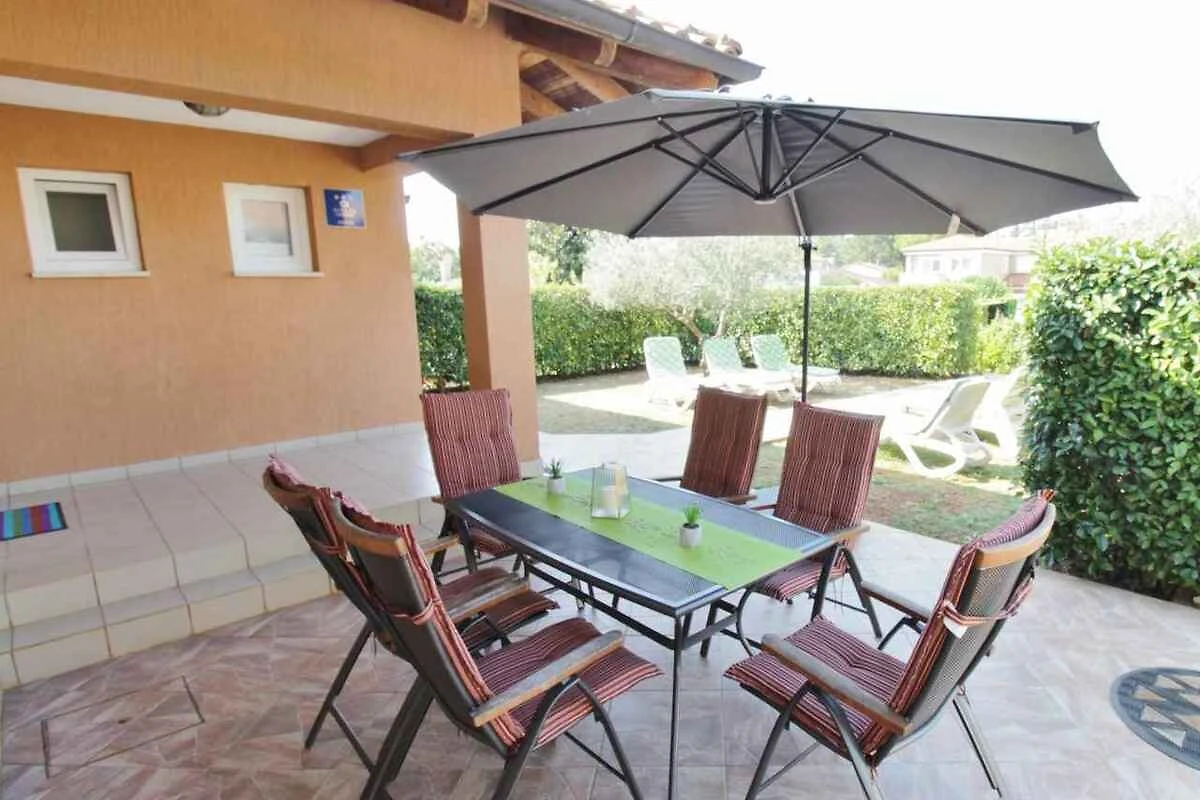 Savudrija. Das Ferienhaus befindet sich auf einem geschlossenen Gartengrundstück mit Blumen und Sträuchern, von einem Zaun und einer Mauer begrenzt. Parkplatz auf dem Grundstück.