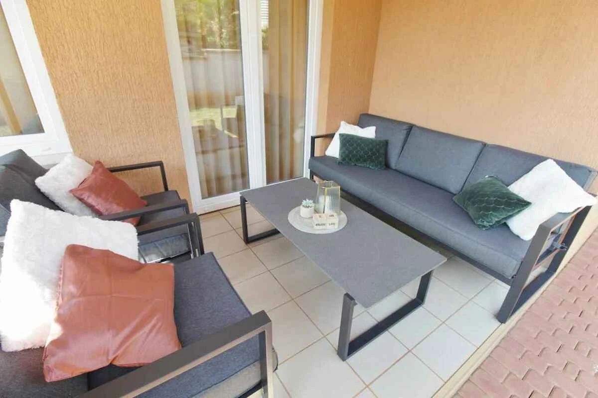 Wohnzimmer mit 2 Zusatzbetten auf Doppelausziehcouch, Sitzecke, TV und Zugang zur Terrasse. 3 Schlafzimmer jeweils mit 2 Einzelbetten. Küche mit Gasherd (4 Flammen), Kühlschrank (Eisfach), Mikrowelle, Kaffeemaschine, Toaster und elektrischem Wasserkocher. Bad mit Waschmaschine und Dusche. Separates WC mit WC.