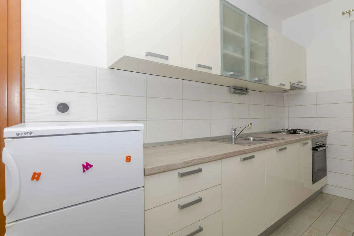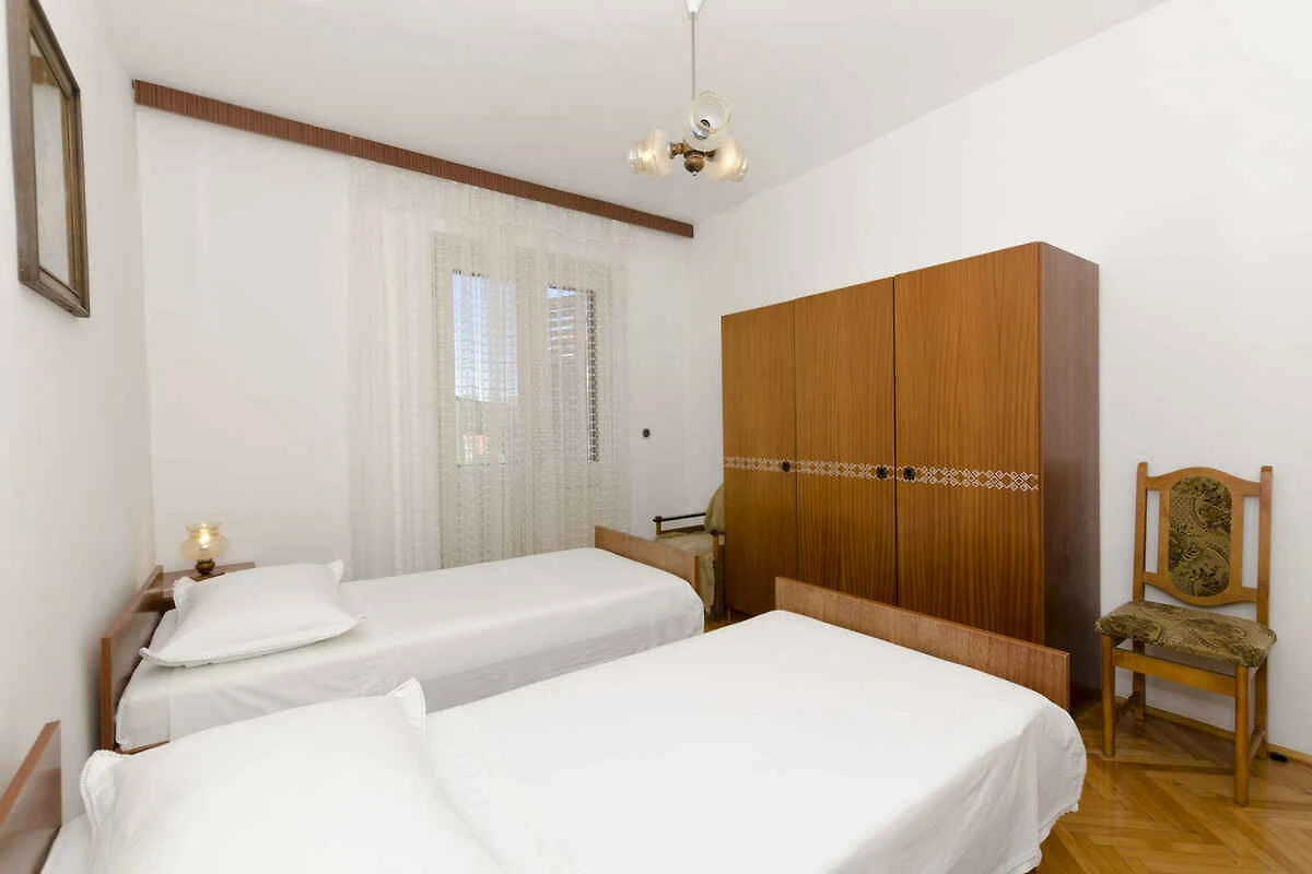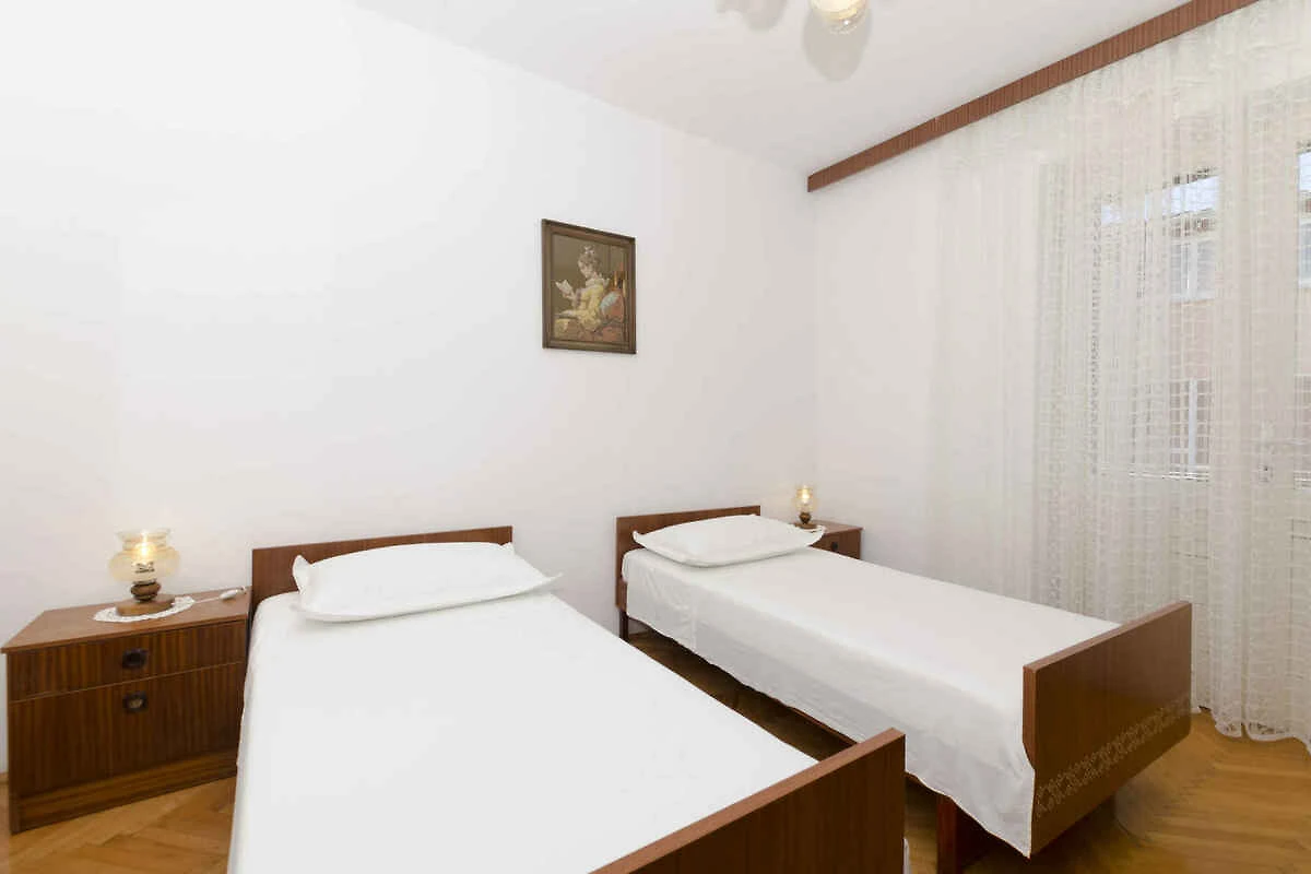 Wohnzimmer mit TV und Zugang zum Balkon (8 qm). Schlafzimmer (12 qm) mit 2 Einzelbetten. Schlafzimmer (12 qm) mit 1 Doppelbett. Kochecke im Wohnzimmer mit Gasherd, Backofen und Kühlschrank. Bad mit Badewanne und WC.