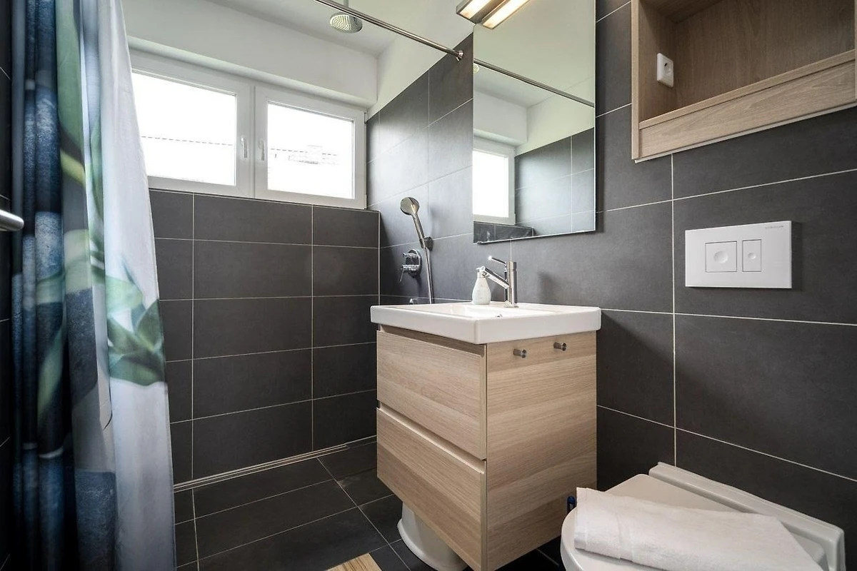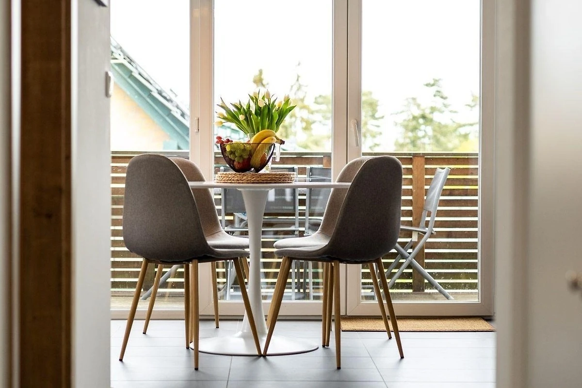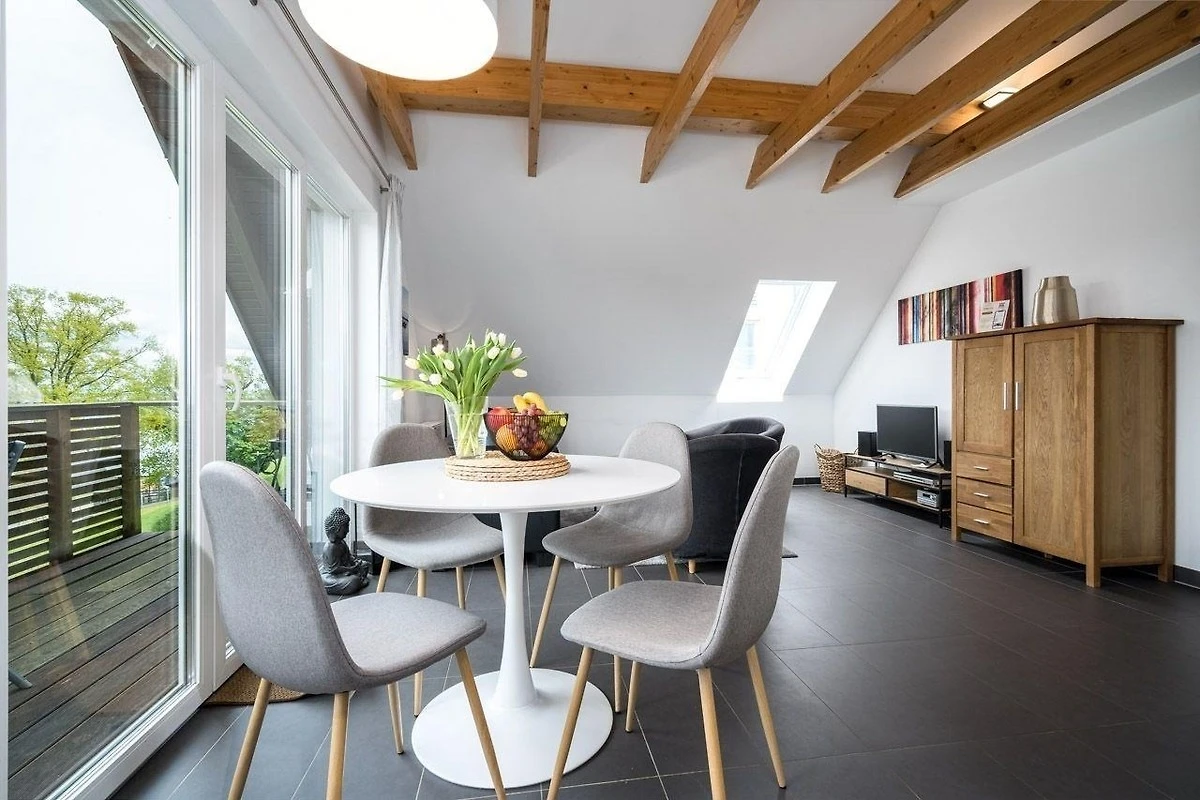 Die Ferienwohnung bietet eine moderne und allergikergeeignete Ausstattung, ideal für Erholung suchende Gäste. Sie verfügt über zwei Schlafzimmer, eines mit einem Doppelbett und eines mit zwei Einzelbetten, sowie ein Badezimmer mit bodengleicher Dusche und Fenster. Die offene Küche ist mit einem Geschirrspüler, einem Elektro- und Gasherd, einem Backofen, einer Mikrowelle und einem Kühlschrank ausgestattet, ergänzt durch eine Kaffeemaschine, einen Wasserkocher und einen Toaster. Ein Kinderhochstuhl steht ebenfalls zur Verfügung.