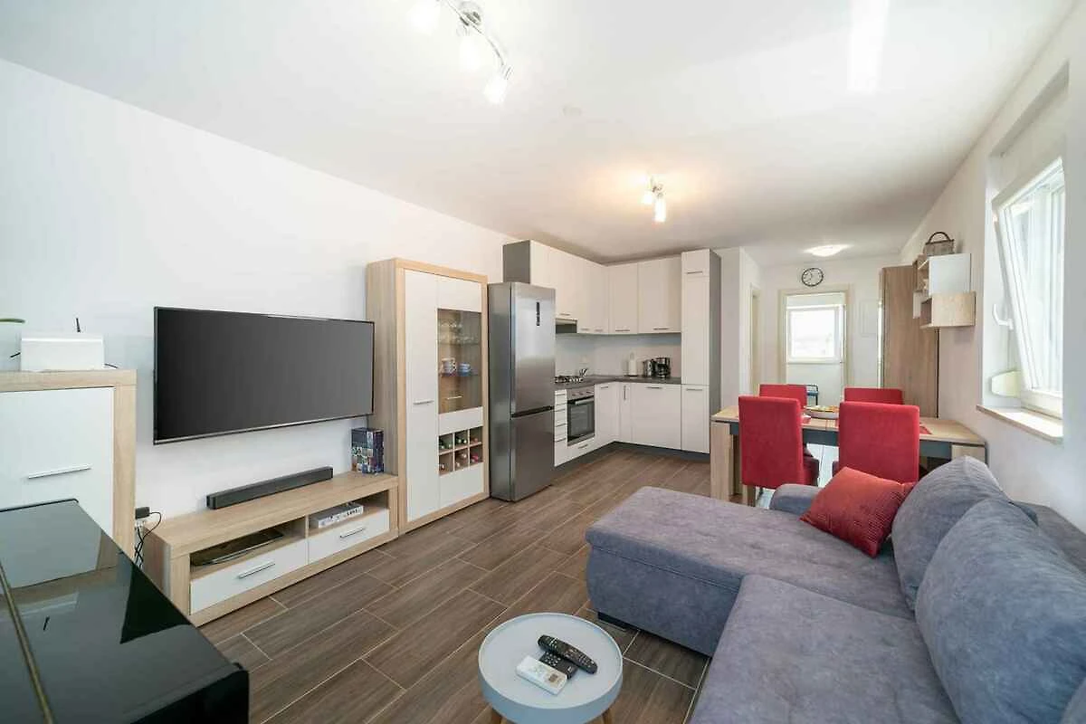 Wohnzimmer mit 1 Zusatzbett auf Couch/Sofa, Sitzecke, TV und Zugang zur Terrasse. Schlafzimmer mit 1 Doppelbett. Kochnische im Wohnzimmer mit Essecke, Gasherd (4 Flammen), Backofen, Geschirrspüler, Kühlschrank (Eisfach), Kaffeemaschine und elektrischem Wasserkocher. Bad mit Waschmaschine, Dusche und Föhn.