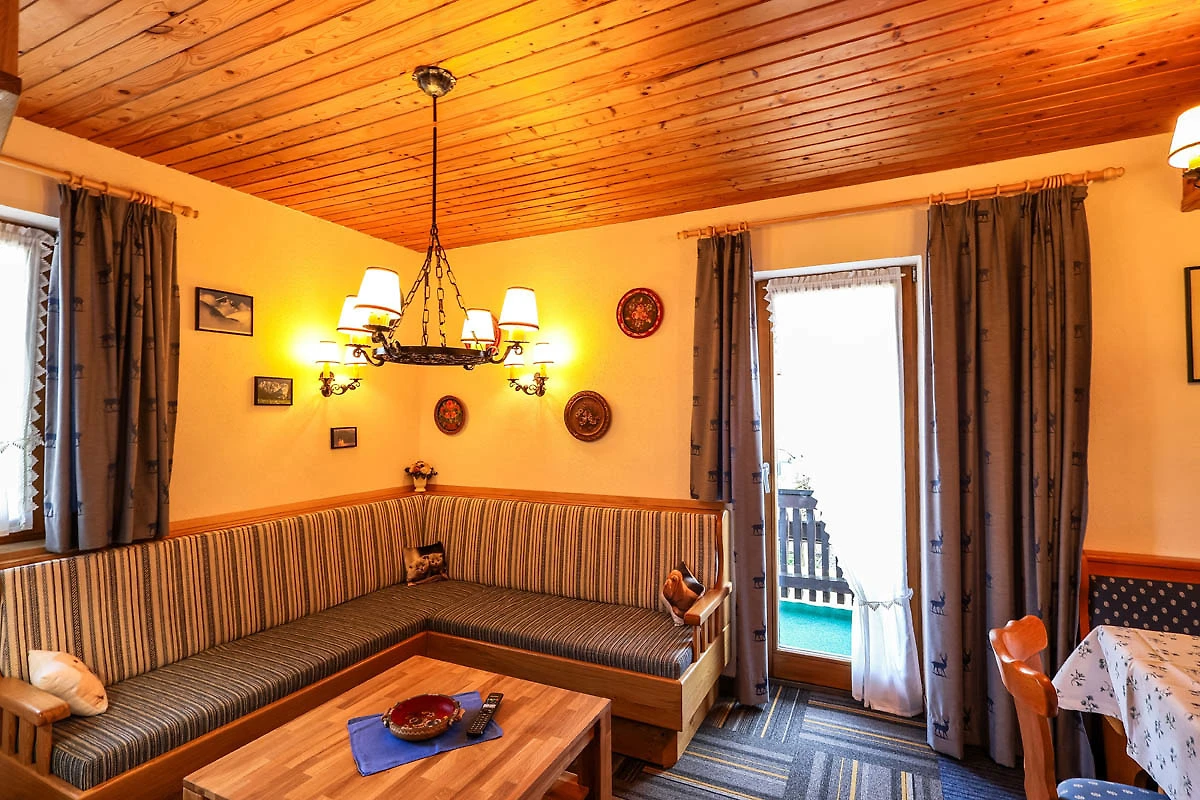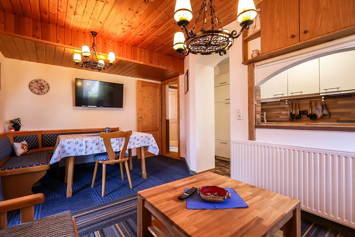 Wohnzimmer mit Essecke. Nord – Ost Balkon.