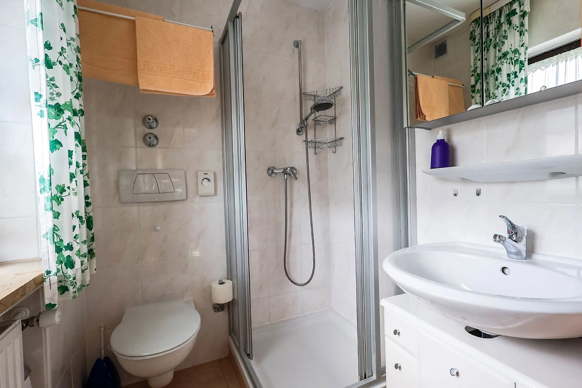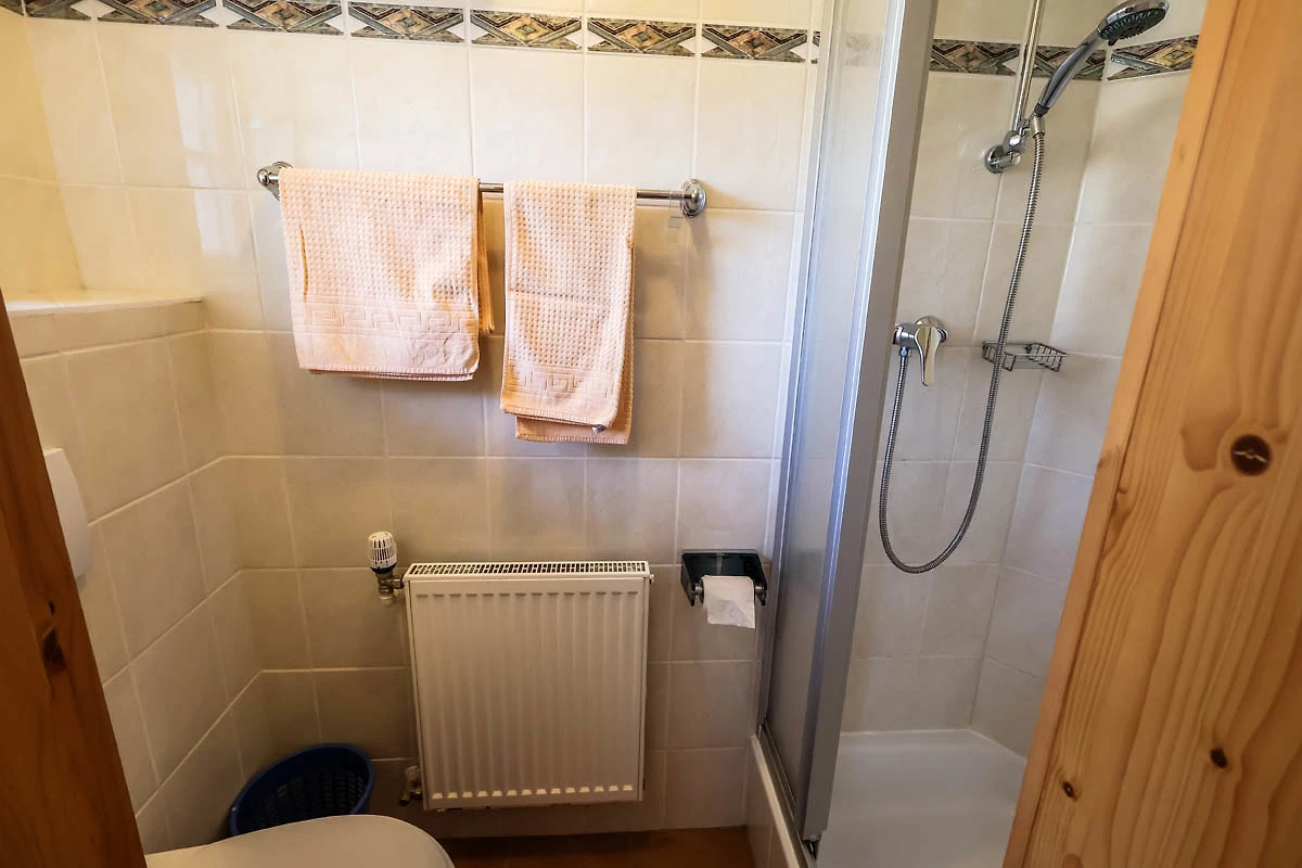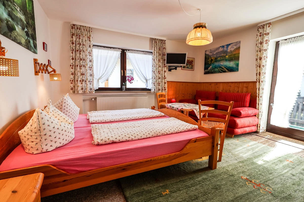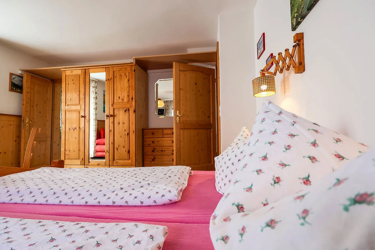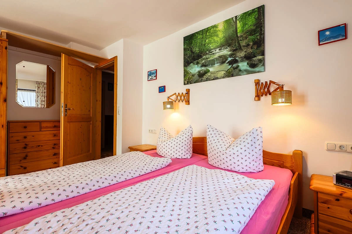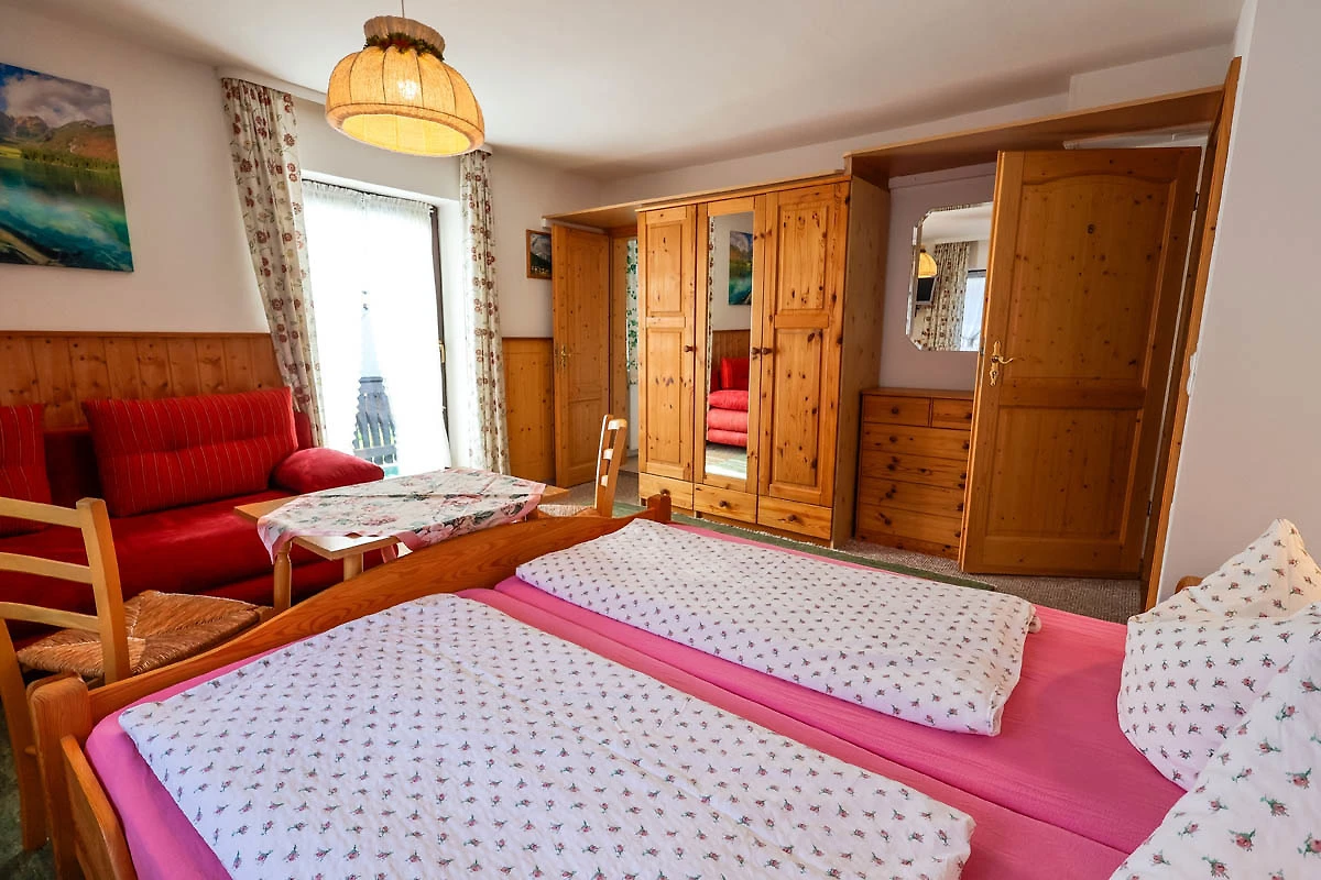 1 Schlafzimmer mit Doppelbett und auszieh-Schlafcouch (Liegefläche 2 x 70 cm x 200 cm), mit D/WC, Föhn, Spiegelschrank, Fernseher, Süd-Balkon.