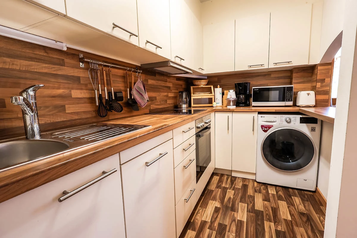 Mikrowelle, Tchibo-Espresso-Maschine, Kaffeemaschine, Toaster, Eierkocher, Wasserkocher, E-Herd 4 Kochstellen mit Backofen, Kühlschrank mit Gefrierfach, Waschtrockner, Geschirrspüler, Geschirrtücher, Safe usw.