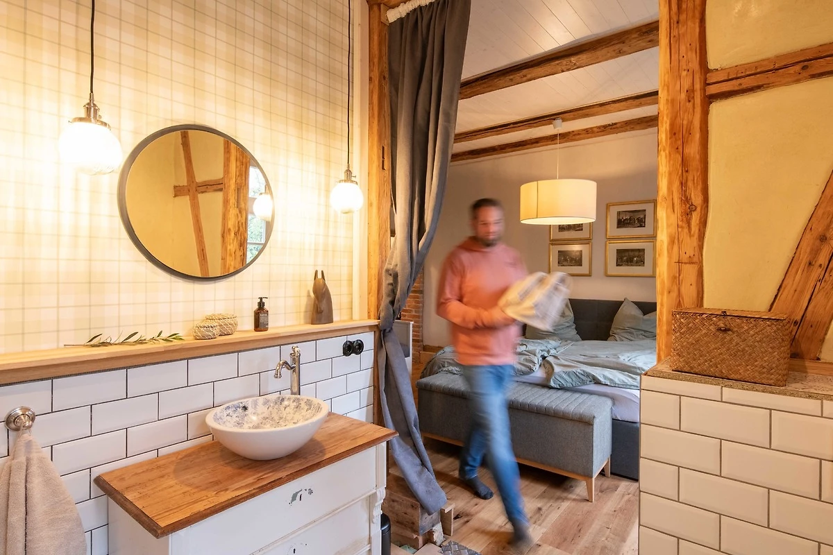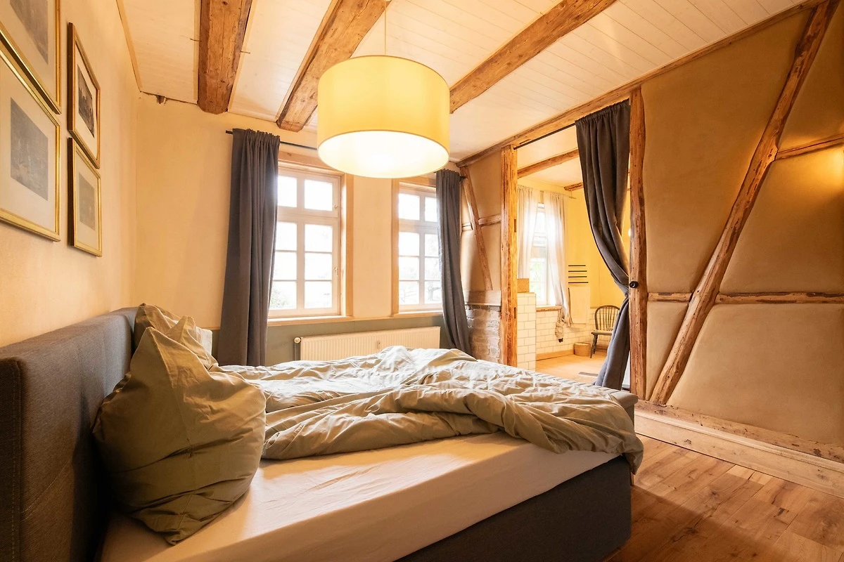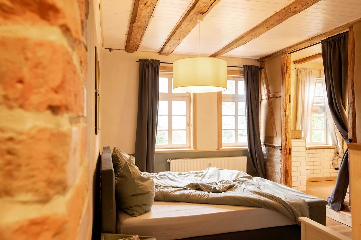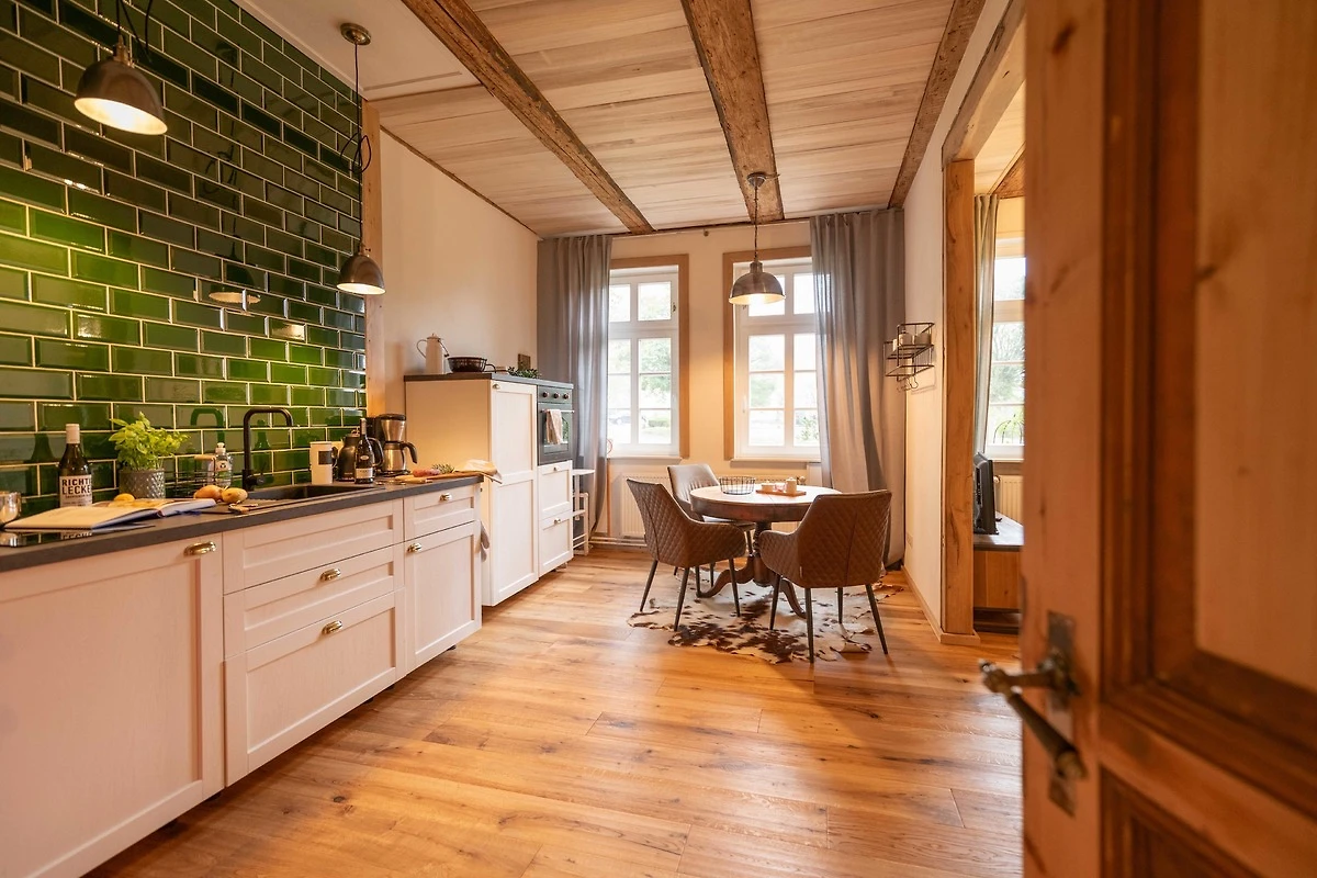 Der Gutshof mit seinem alten Gebäude- und Baumbestand liegt mitten im Weserbergland. Direkt angrenzend erstreckt sich das Areal der bekannten und renommierten Porzellanmanufaktur Fürstenberg, die im Schloss ein fantastisches Museum und am Schlosshof einen Werksverkauf betreibt. Vom Schlosshof hat man einen herrlichen Blick ins Wesertal. In Sichtweite liegt die Fachwerkstadt Höxter mit einem breiten Angebot an Gastronomie und Einkaufsmöglichkeiten. Für den täglichen Bedarf gibt es in Fürstenberg einen Dorfladen sowie eine Fleischerei mit Mittagsangeboten. Im Bistro Carl auf dem Schlosshof gibt es ebenfalls eine kleine saisonale Mittagskarte. Unser Hof bietet ausreichend Platz für Ihr Auto, Fahrrad oder Kanu. Hinter dem Haus führt ein Feldweg hinauf zur Kirschallee, die weiter in das tiefe Waldgebiet des Solling verläuft und zu stundenlangen Wanderungen ermuntert. In die andere Richtung erreicht man über einen Wanderweg am Schlossberg hinunter die Weser. Mit dem Rad empfehlen wir den Burgweg, der nach Boffzen führt und auf den Weser-Radweg mündet. Fürstenberg liegt etwa 100 Meter ÜBER der Weser!