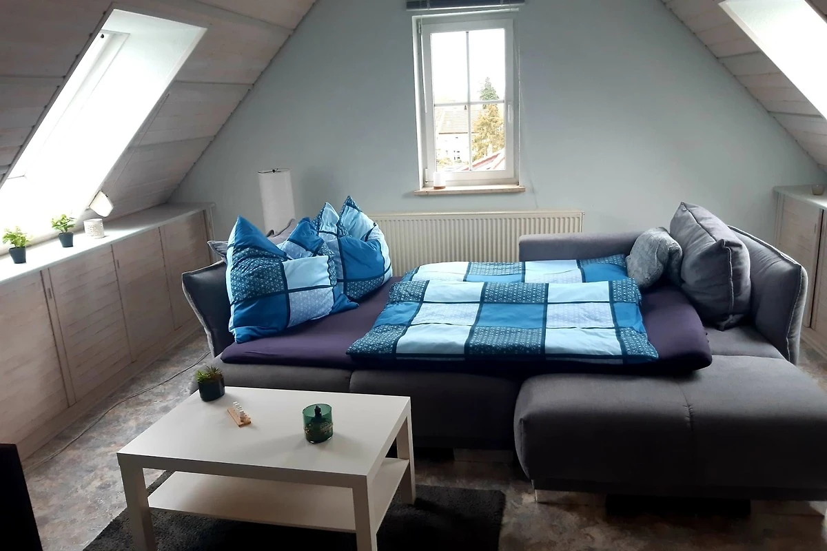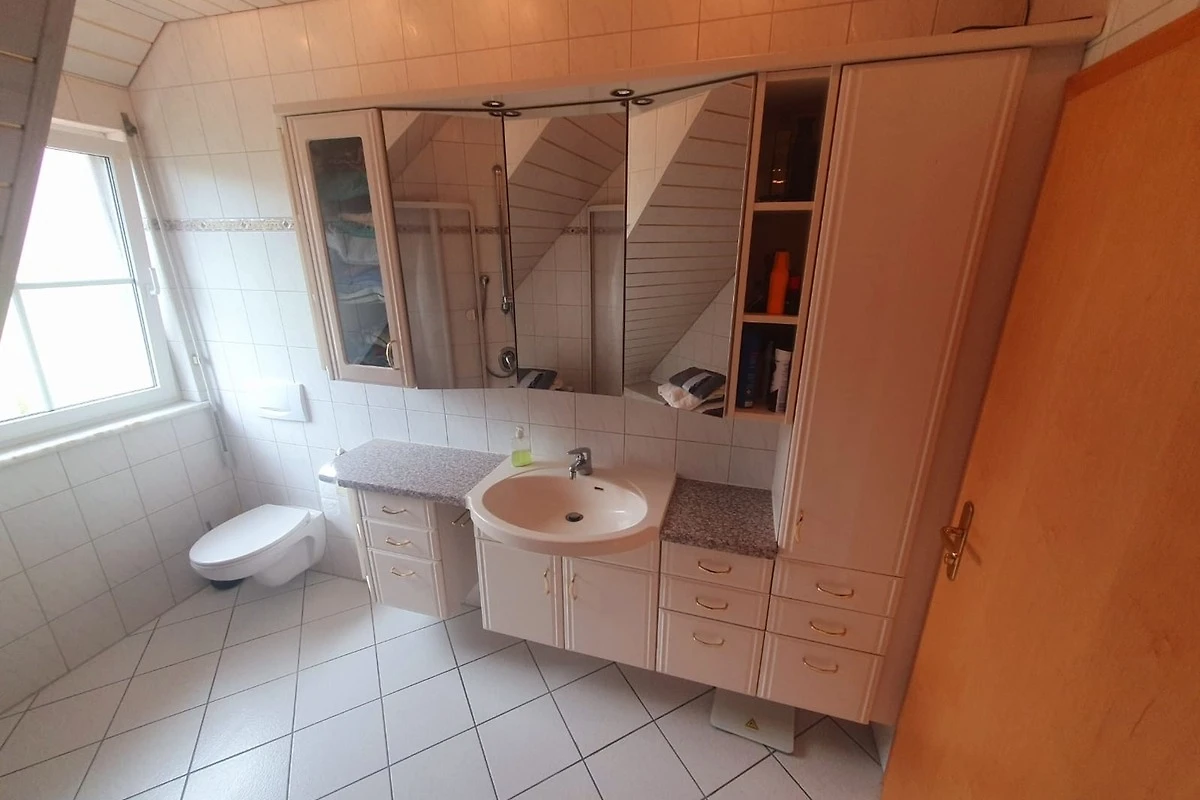 Die FeWo im Dachgeschoss kann bis zu sechs Personen beherbergen. Hier haben wir ein Schlafzimmer mit Doppelbett , ein Schlafzimmer mit zwei Einzelbetten und ein Schlafzimmer mit einer Kingsize Ausziehcouch im Spitzboden. Zudem gibt es ein Esszimmer mit Aufenthaltsbereich und Fernseher, eine Küche mit Balkon und ein Badezimmer.