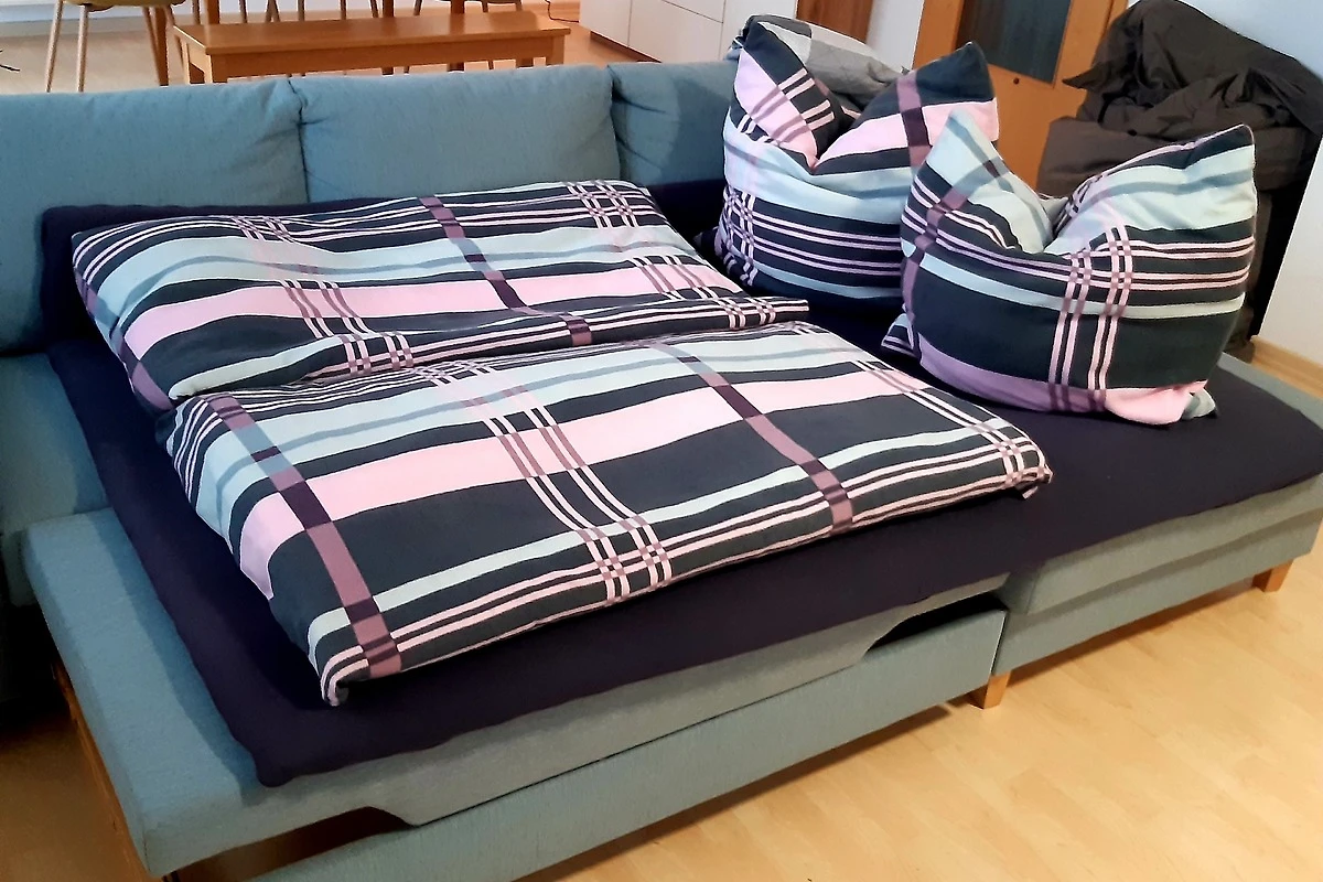 Die FeWo im Erdgeschoss ist für bis zu vier Personen ausgelegt. Hier haben wir ein Schlafzimmer mit Doppelbett und eine Queensize Schlafcouch, die dann im Wohn-/Esszimmer ausgezogen wird. Hier haben Sie direkten Zugang zur Sonnenterasse, der vollausgestatteten Küche und dem Badezimmer.
