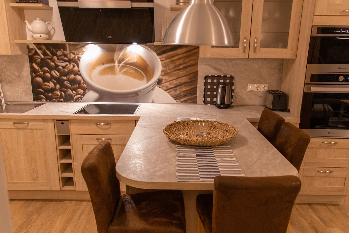 Ausstattung der Küche: Geschirr und Besteck für 12 Personen, Gläser, Töpfe, Toaster, Kaffeemaschine, Wasserkocher, Mikrowelle, Backofen, Induktionsfeld, Dunstabzug.