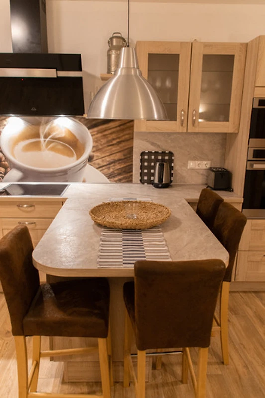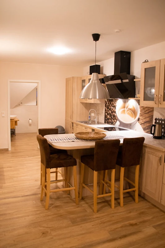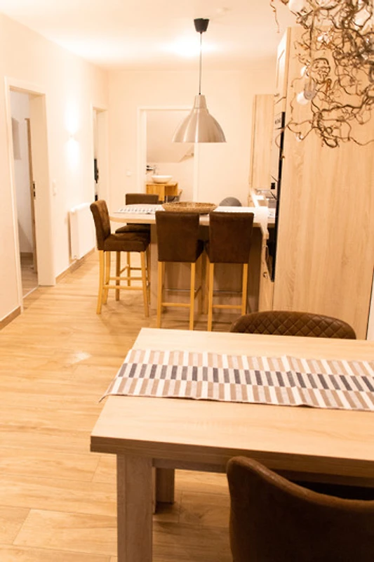 In dieser Wohnung gibt es ein Wohn- und Esszimmer mit Sat-TV und grosszügiger Küche mit Tresen und Barhockern, 2 Schlafzimmer, Bad, W-lan.