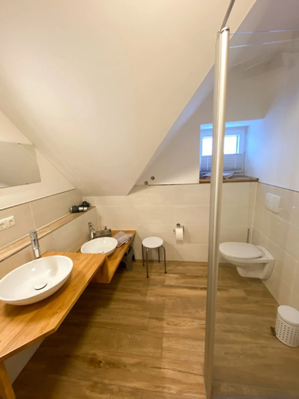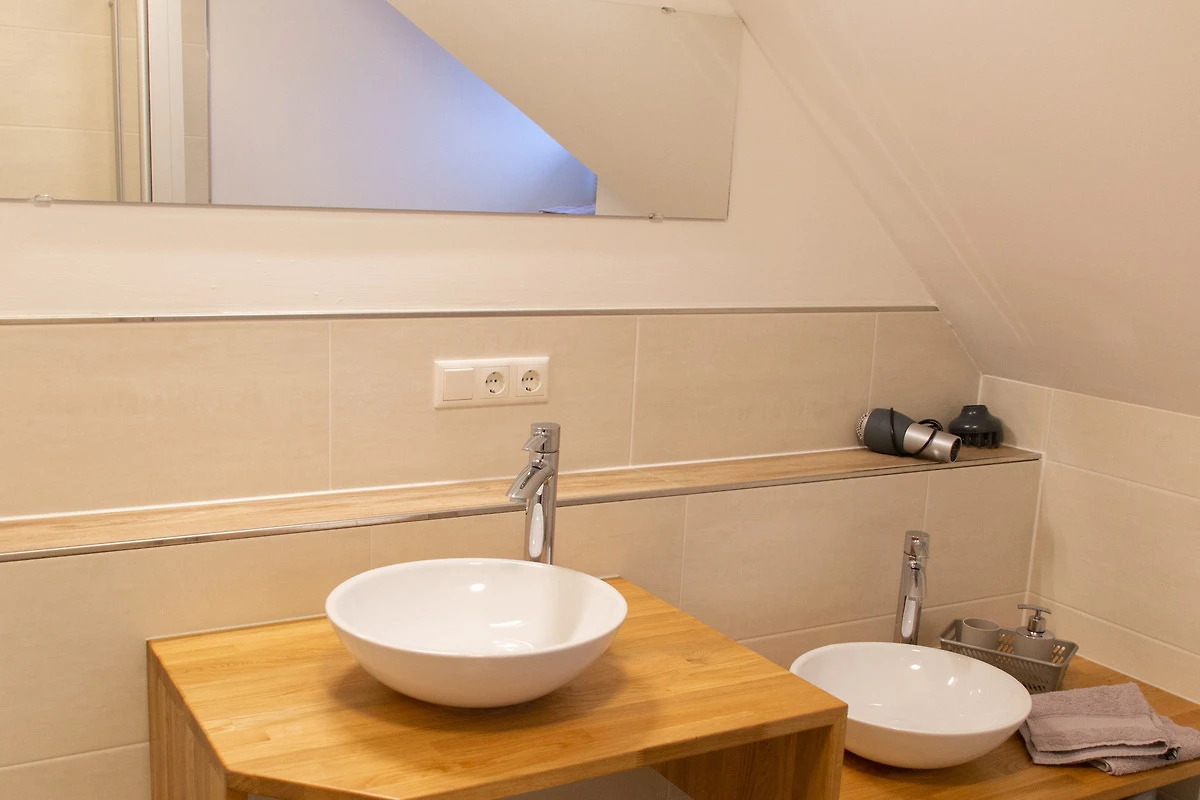 Bad mit grosser, ebenerdiger Dusche, Holzwaschtisch mit zwei Waschbecken, Handtuchtrockner.