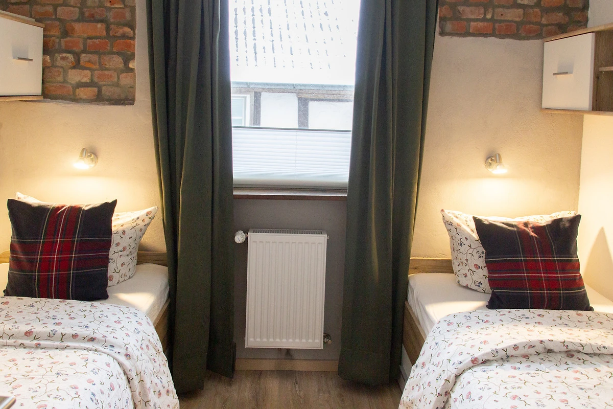 Schlafzimmer 1 Boxspringbett (Doppelbett) und Sat-TV, Schlafzimmer 2 mit 2 Einzelbetten.