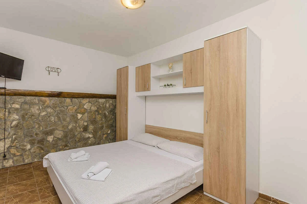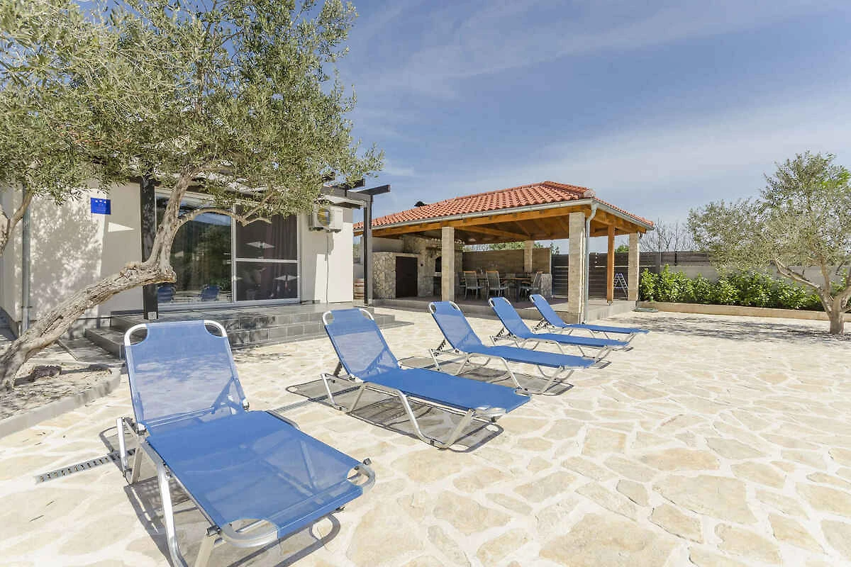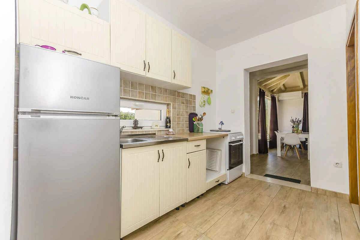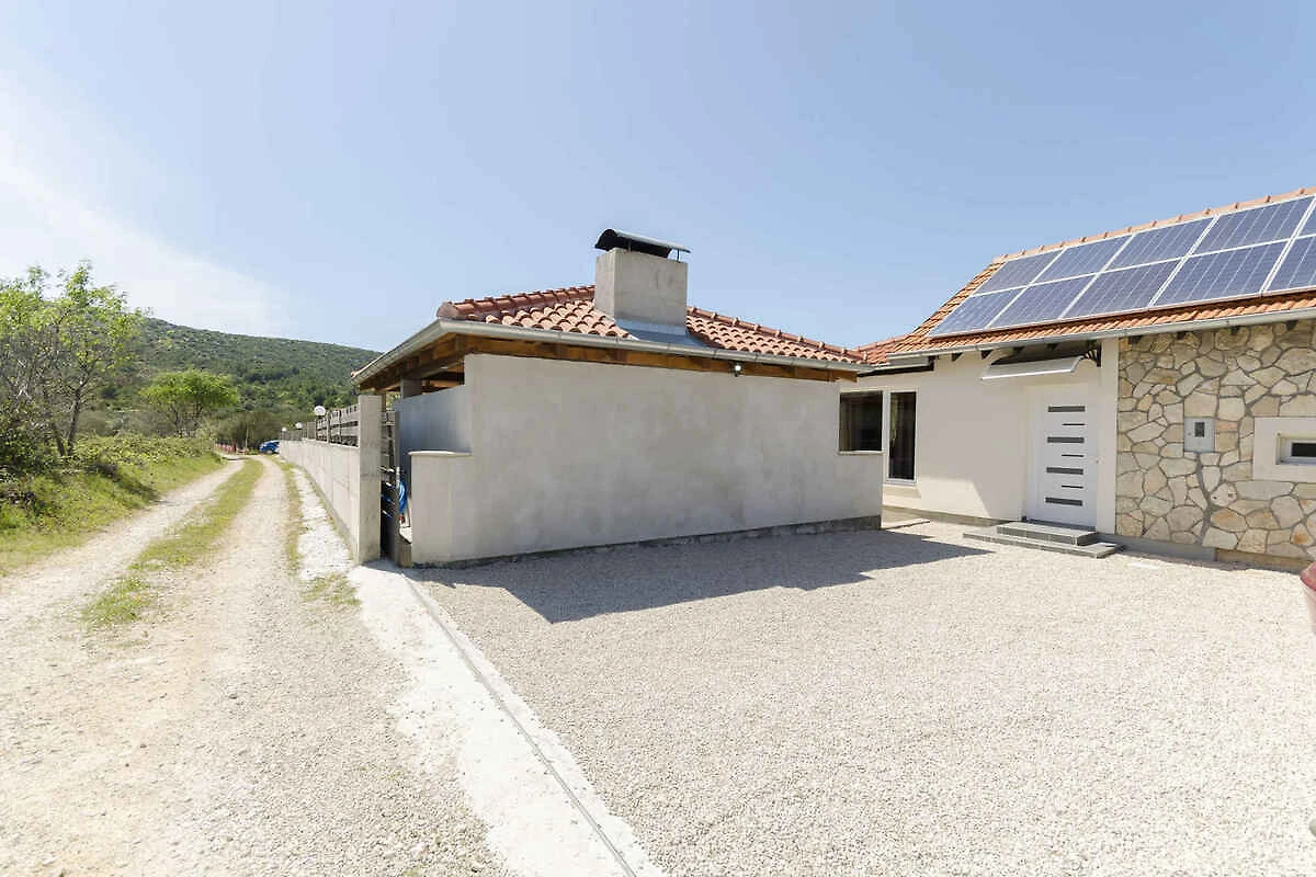 Tribunj. Das Ferienhaus befindet sich auf einem 2000 qm grossen, geschlossenen Gartengrundstück mit Blumen und Bäumen, von einem Zaun begrenzt. Parkplatz auf dem Grundstück.