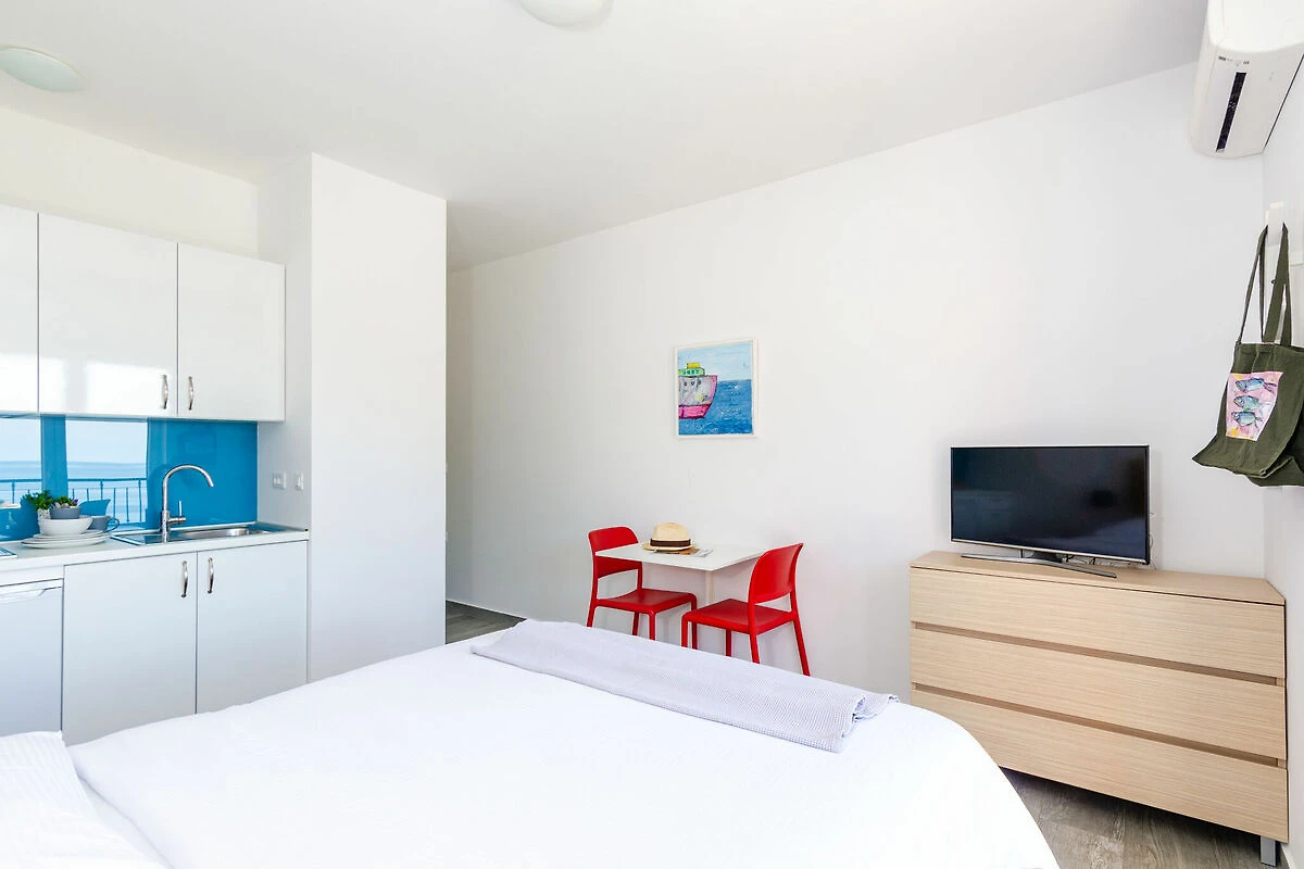Overlooking the Adriatic sea this studio apartment with furnished balcony is perfectly fit for up to two people. The studio features free WiFi, AC, SAT LCD TV, equipped mini kitchen and dining area. The private bathroom comes with a shower, toilet, hairdryer and free toiletries.